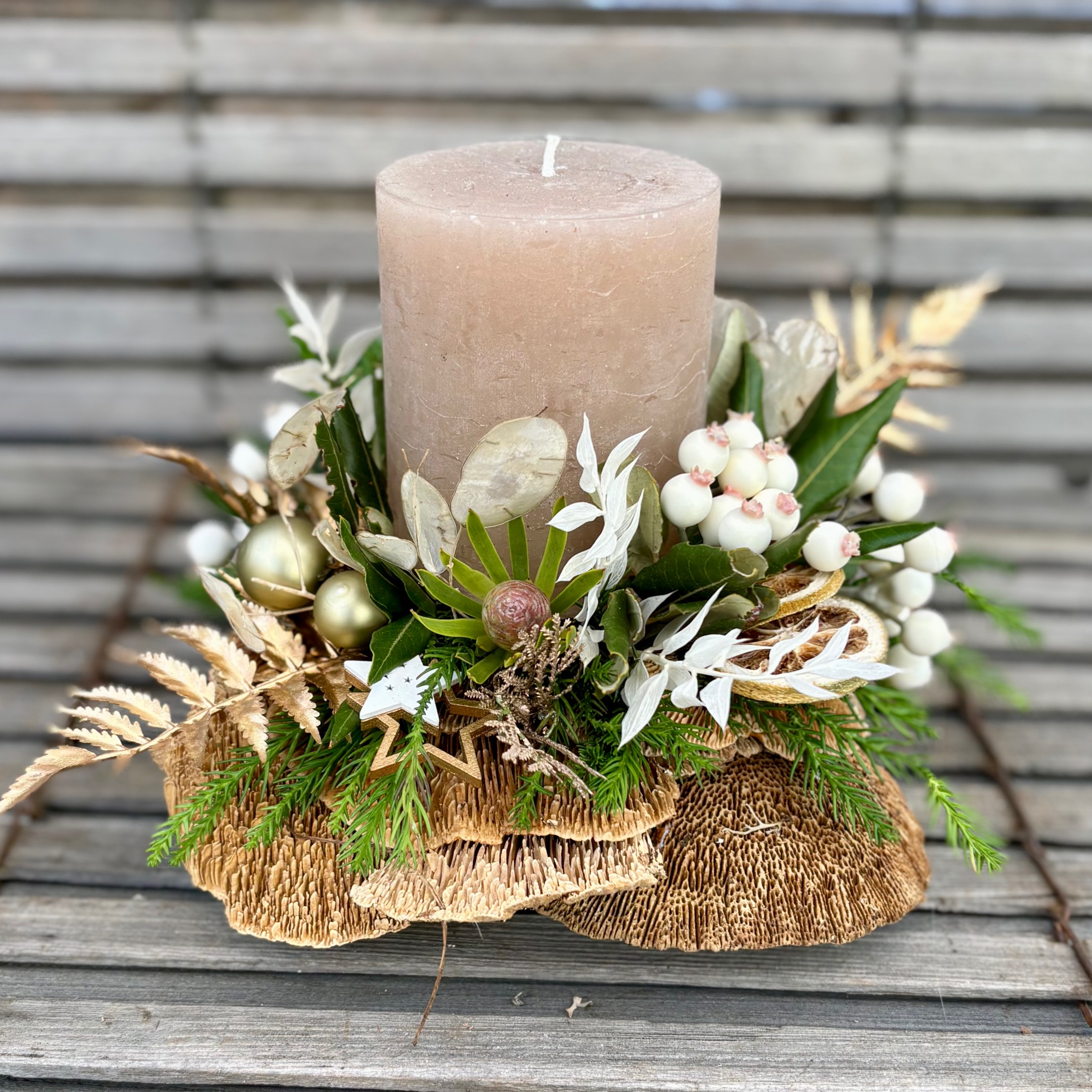 Gesteck auf Teller aus Baumschwamm, Kerze, heimischen Koniferen und passender Deko.