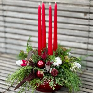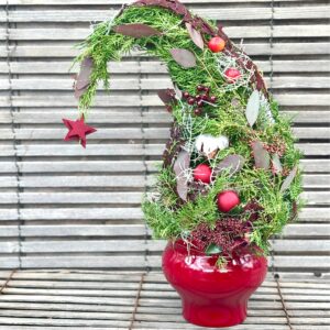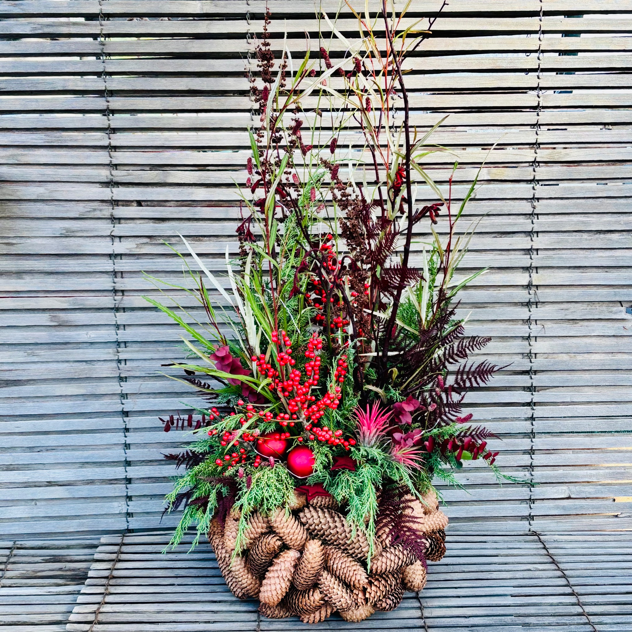 Gefäß aus Fichtenzapfen mit floraler Deko und Lichterkette.