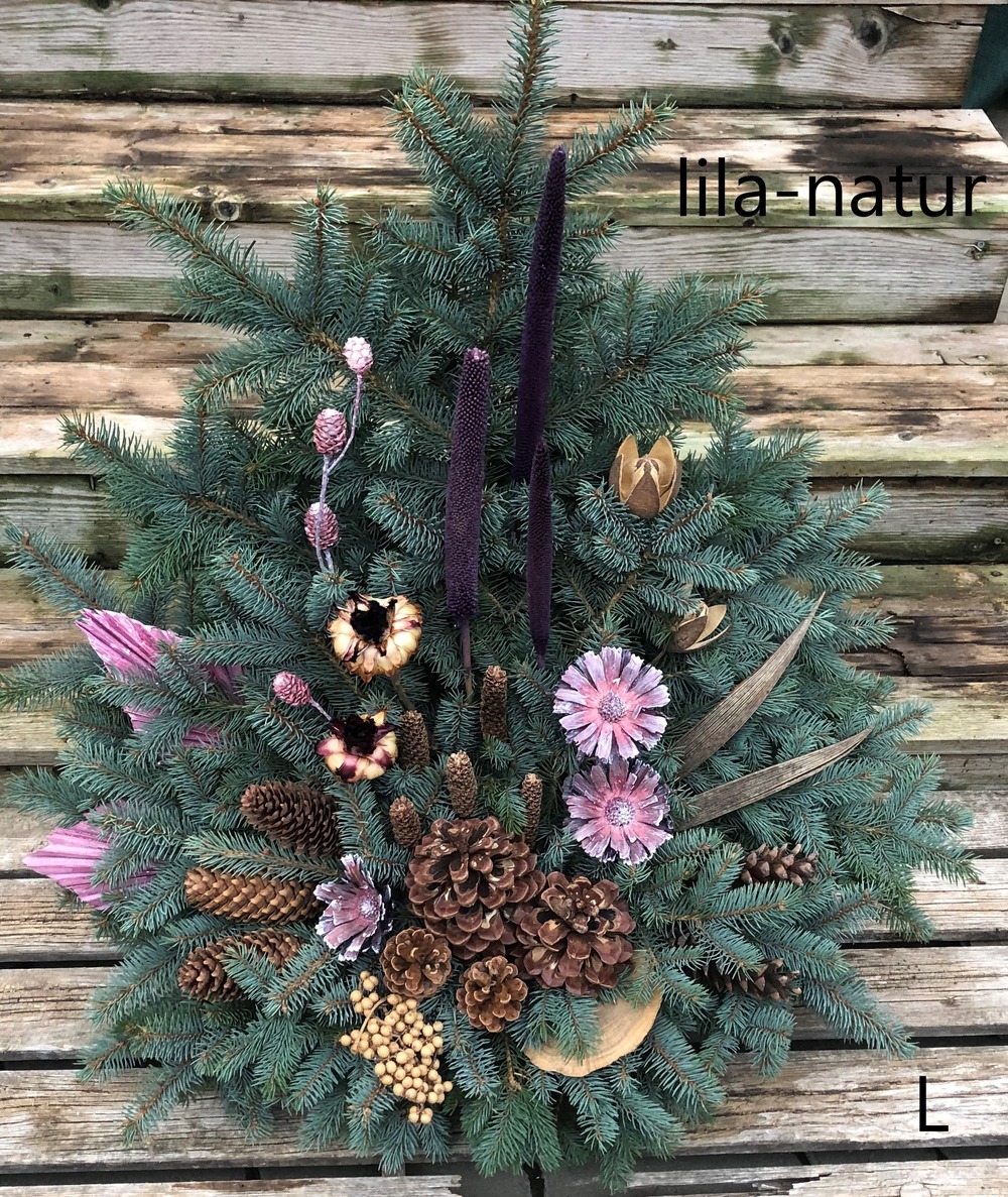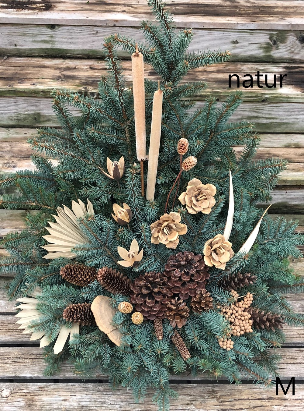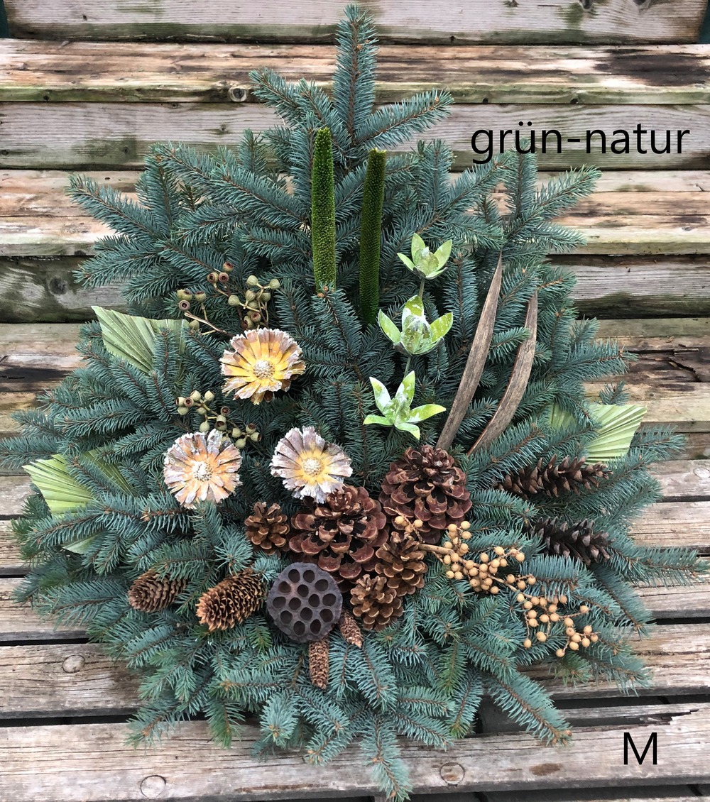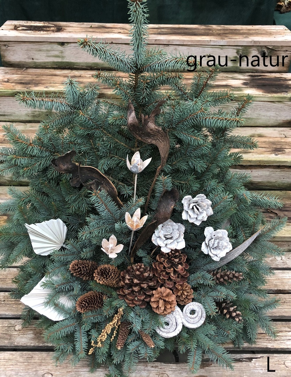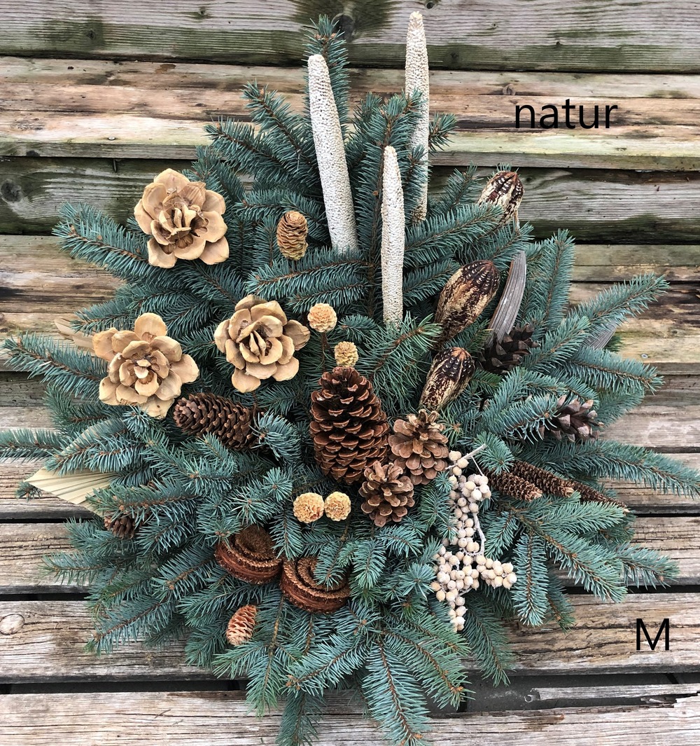 Gesteck aus Silbertannenreisig mit verschiedenen Zapfen und Trockenmaterialen.