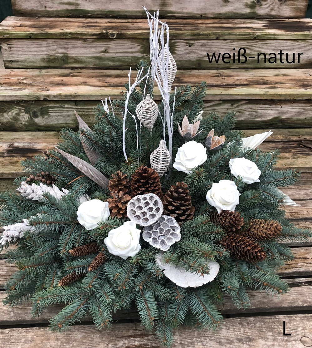 Gesteck aus Silbertannenreisig mit verschiedenen Zapfen und Trockenmaterialen.