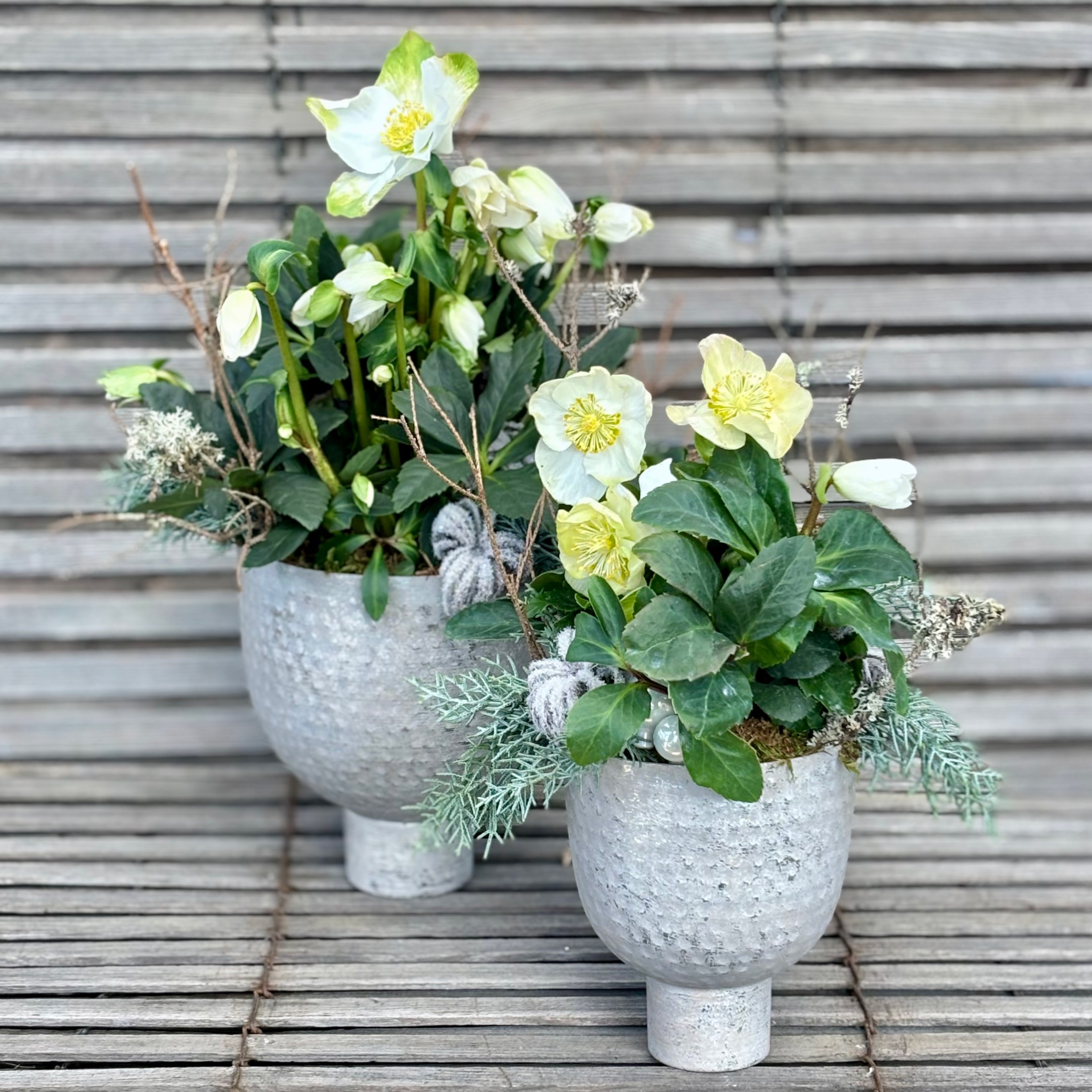 Hochwertige elegante Metallschale befüllt mit Schneerose und passender Deko.