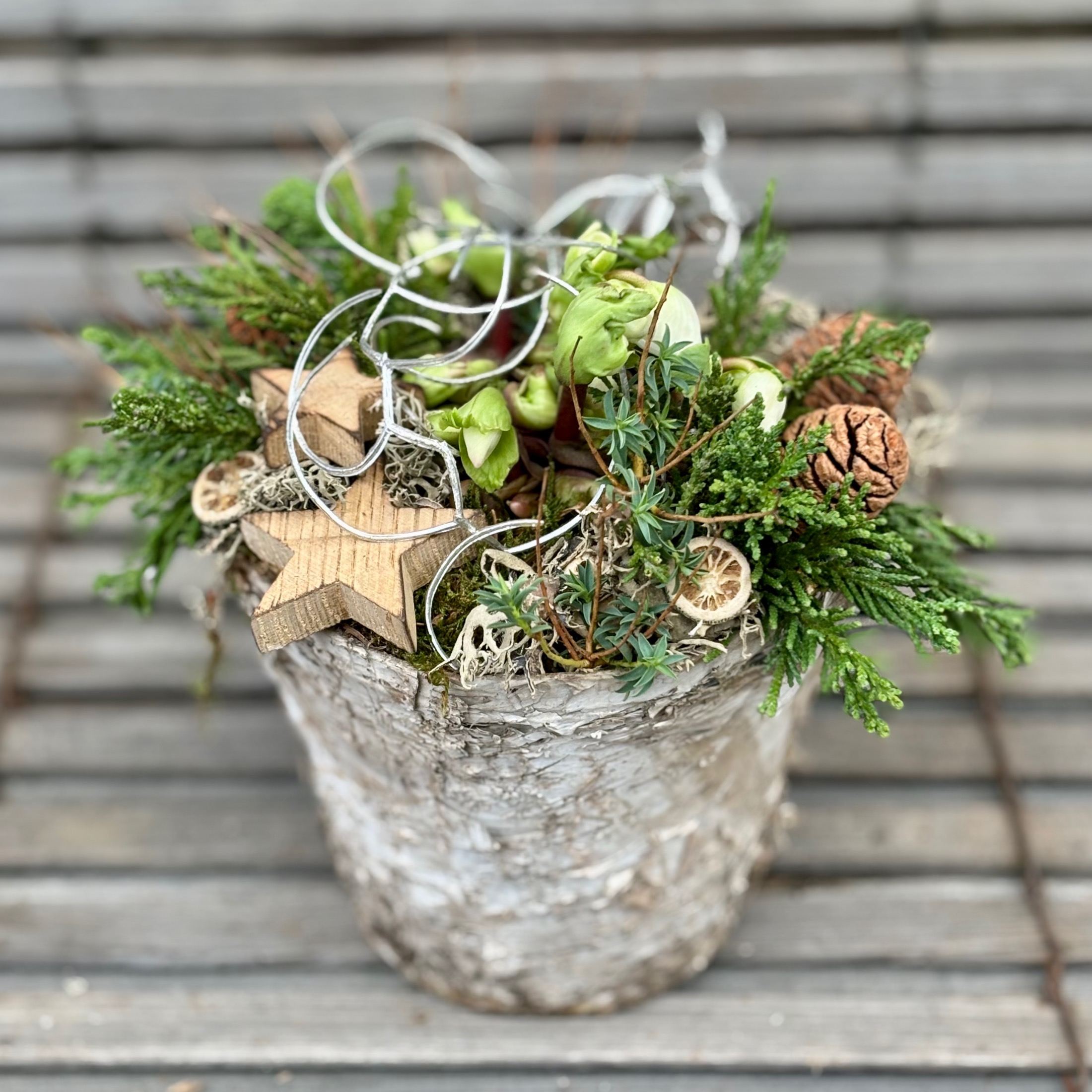 Schneerose ohne Laub im Birkentopf mit passender Deko.