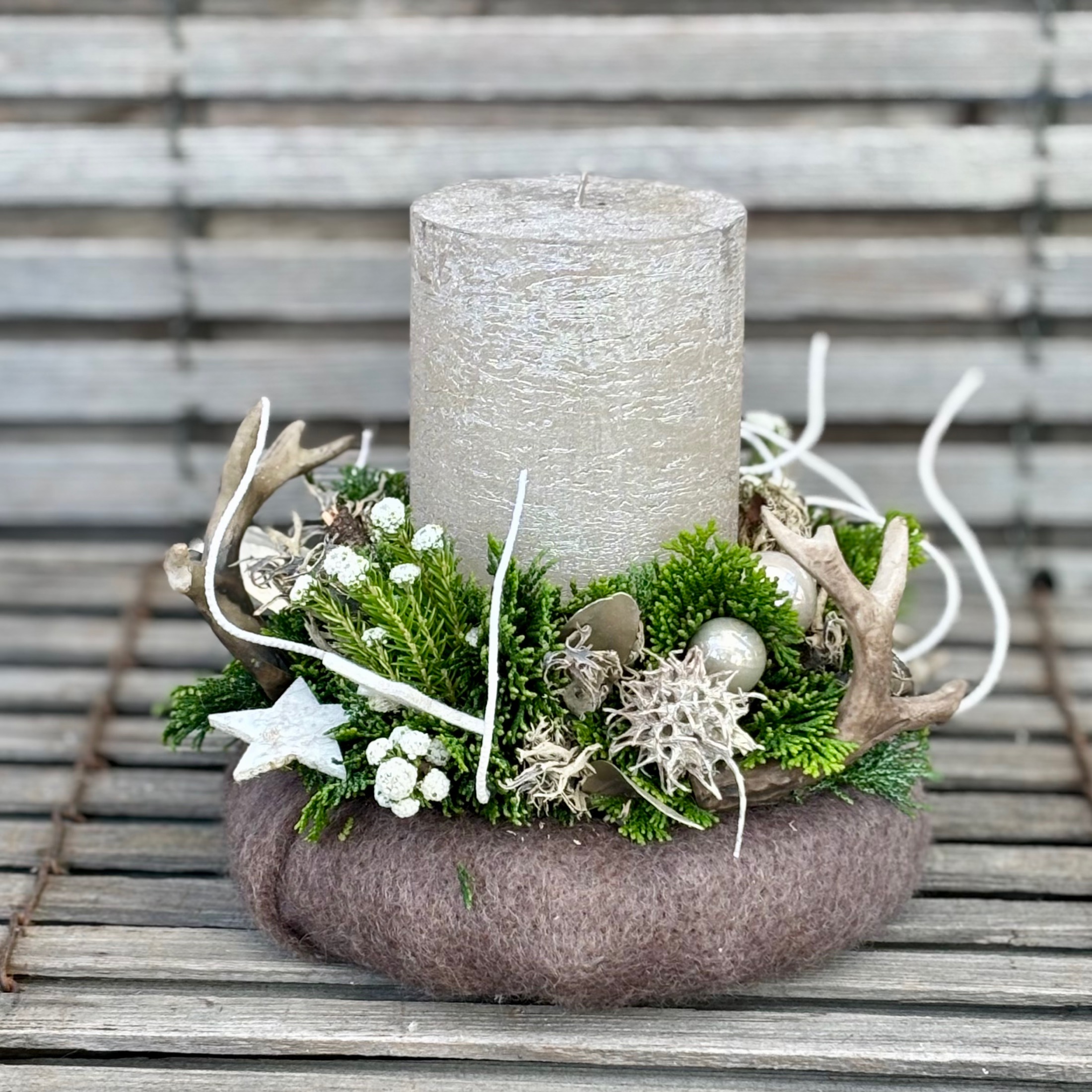 Gesteck auf Teller mit Filzkranz, Kerze und passender Deko.
