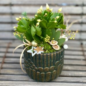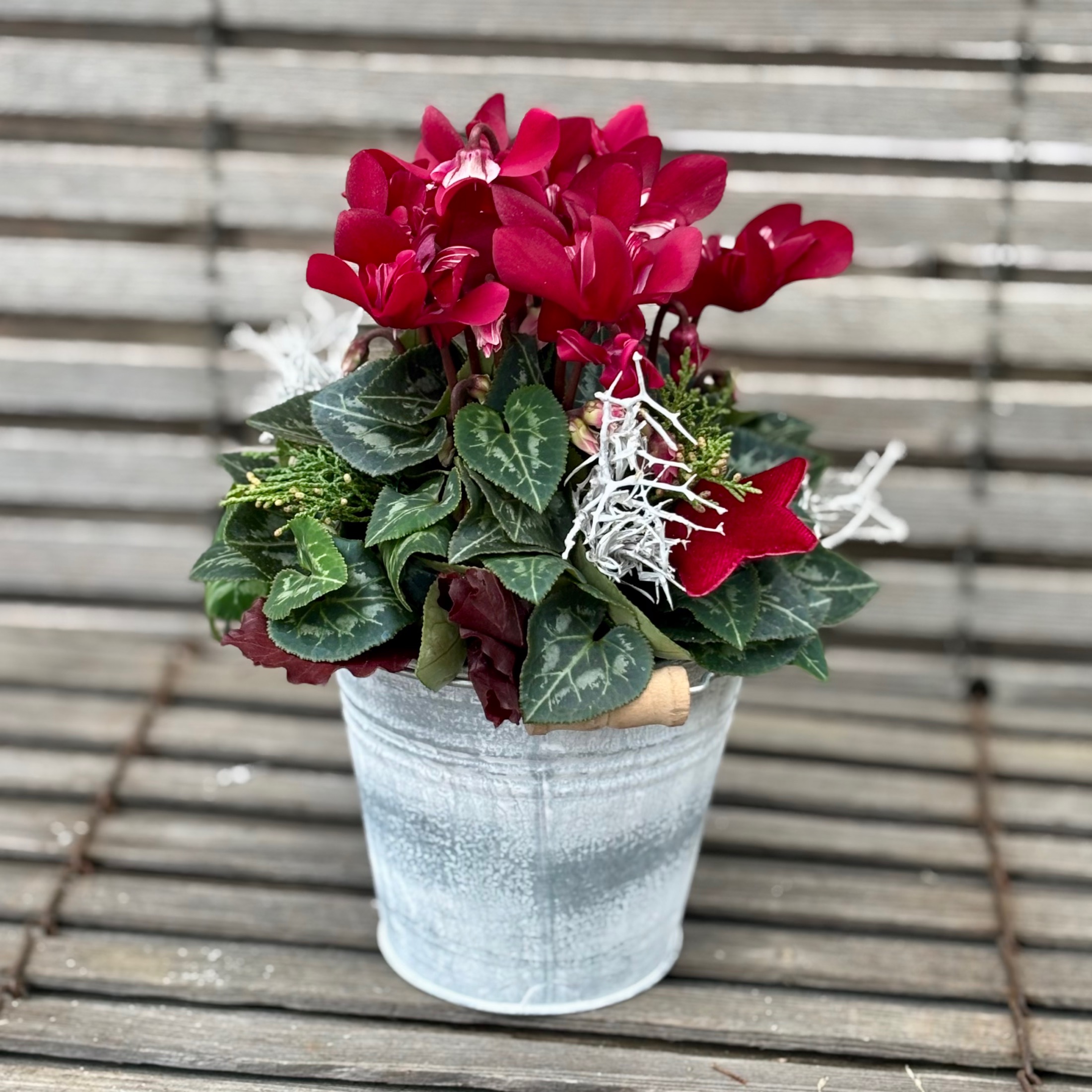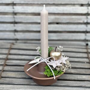 Metallküberl in grau befüllt Kerze oder Bepflanzung, heimischen Koniferen und passender Deko.