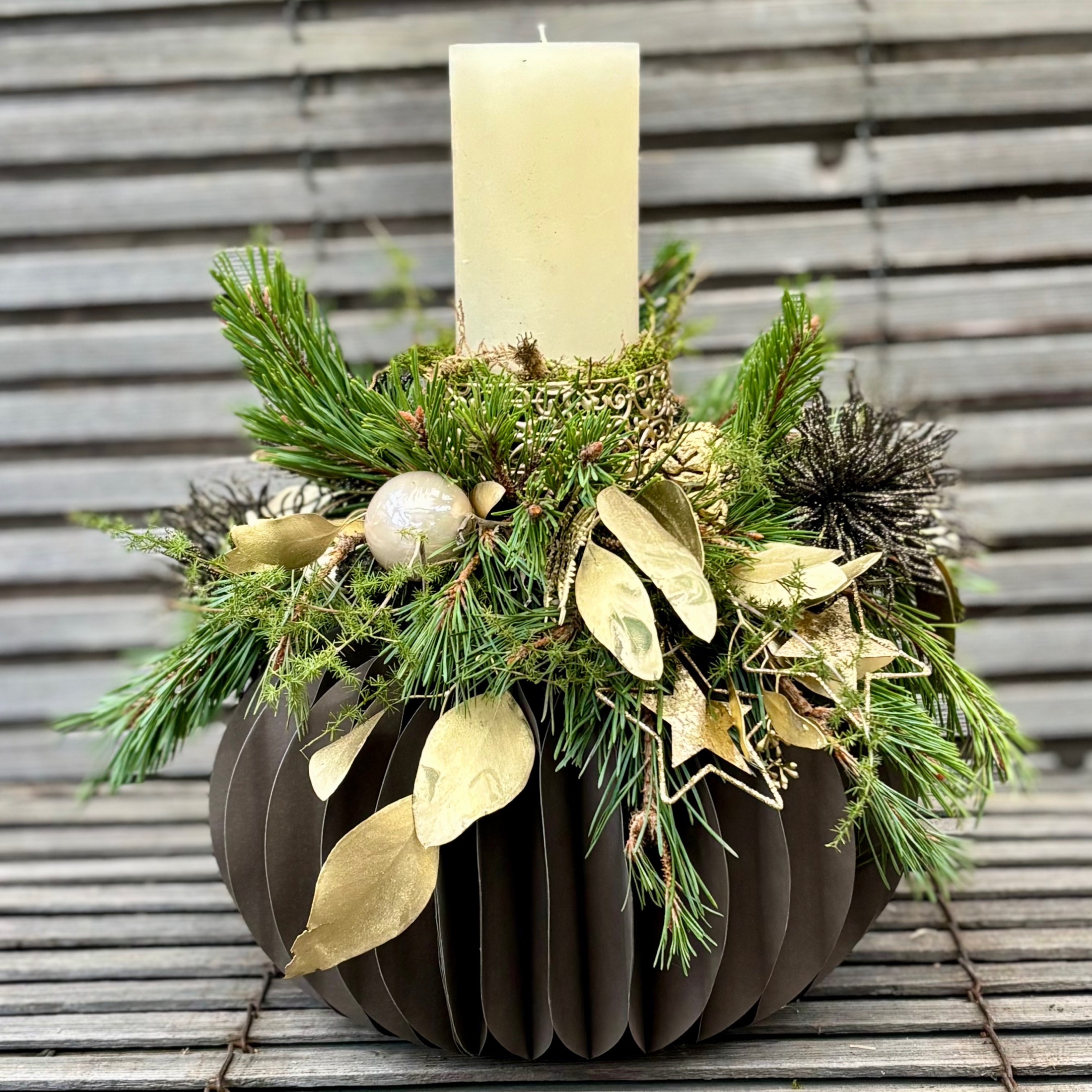 Papiersockel (faltbar) mit Dekoration aus Kerze, einheimischen Koniferen und passender Deko.
