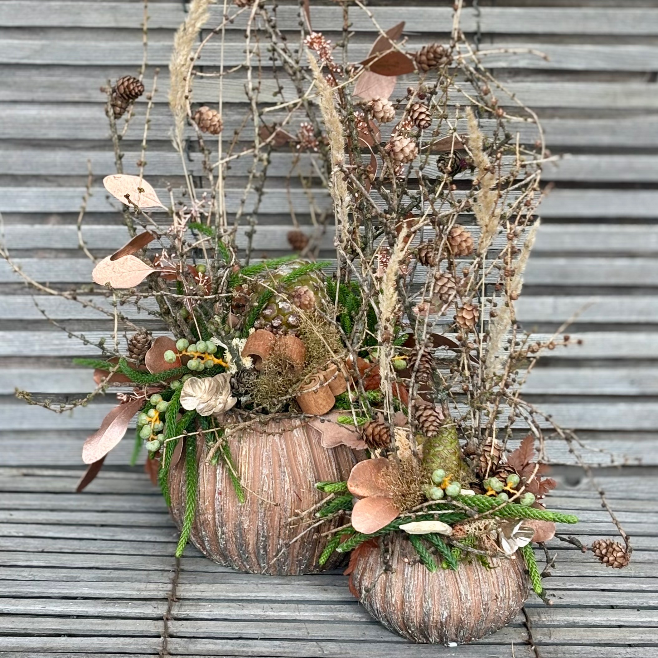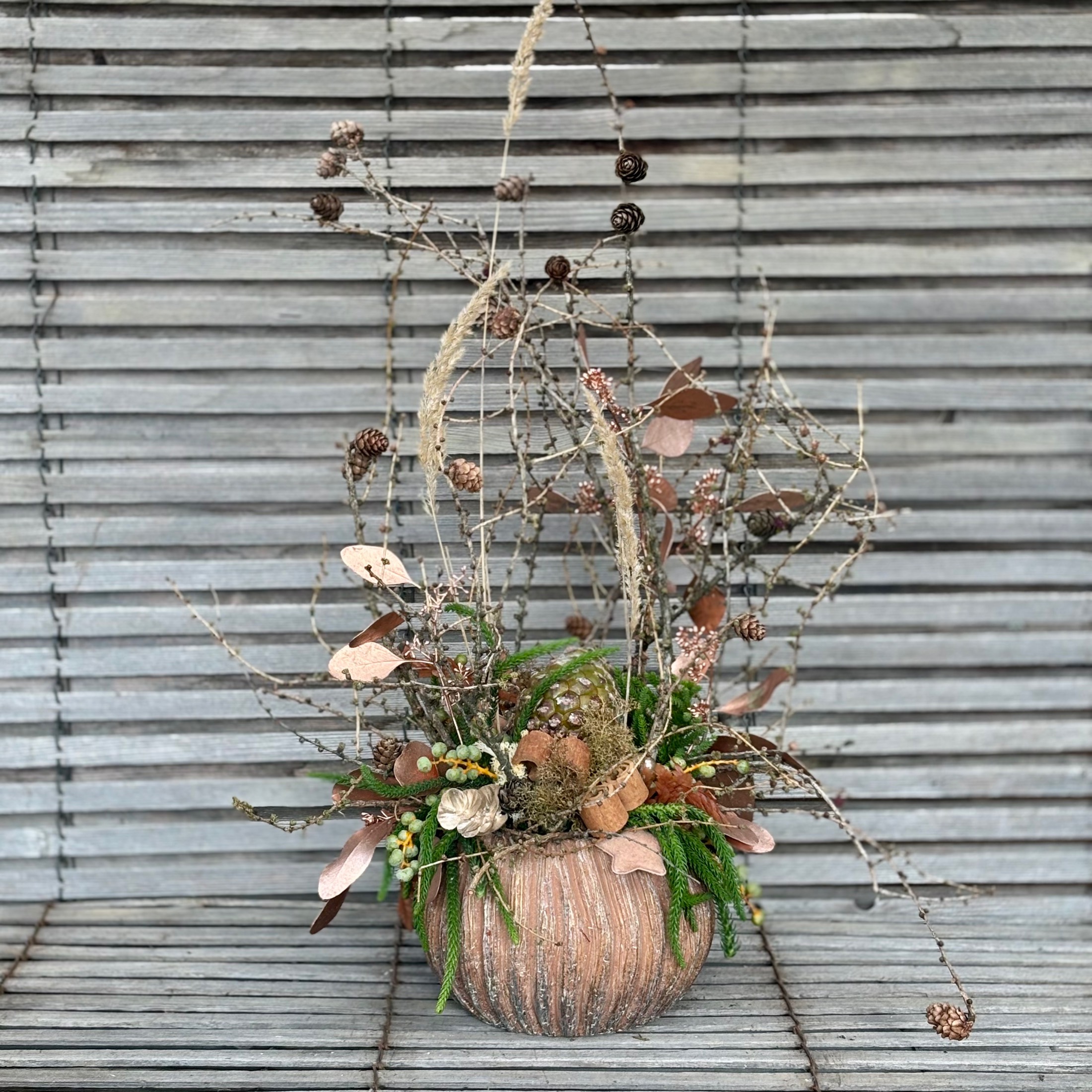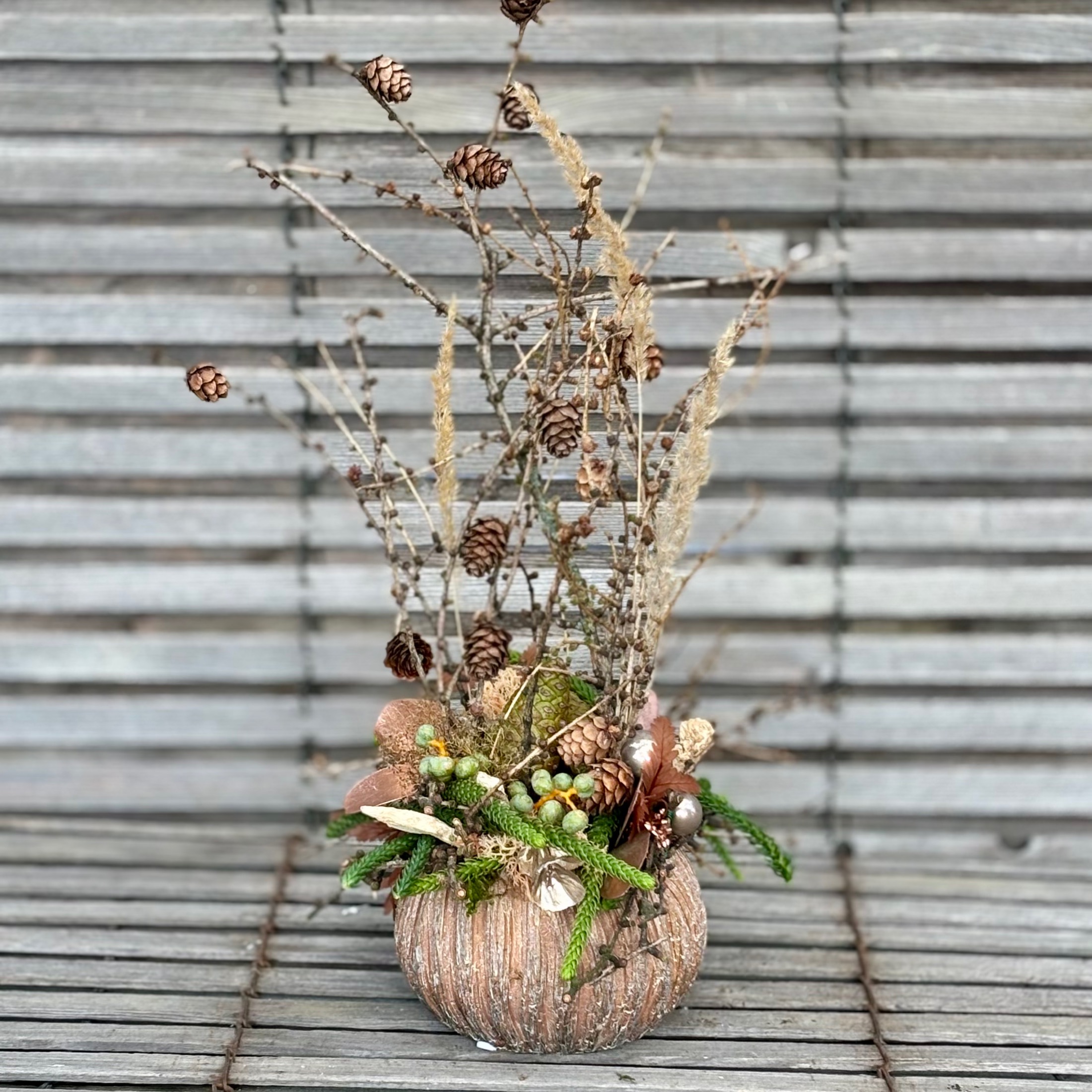 Massive Keramikserie mit Lerchenzweigen, frischem Pinienzapfen und passender Deko.
