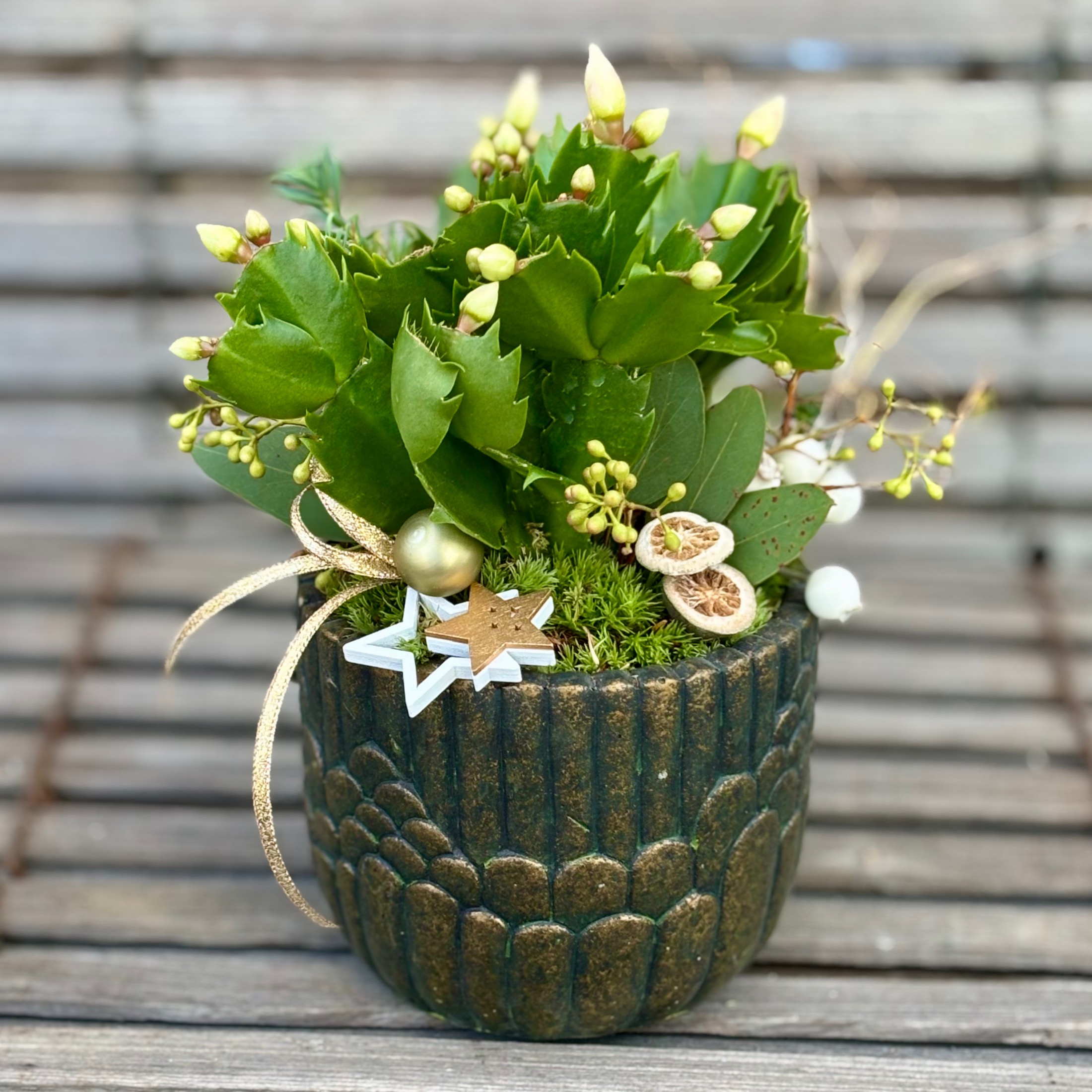 Gold-grüne Keramikserie befüllt mit Weihnachtskaktus und passender Deko.