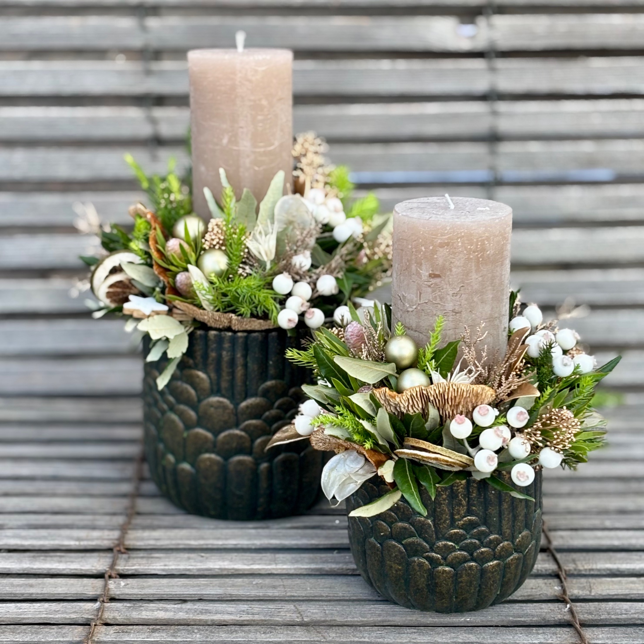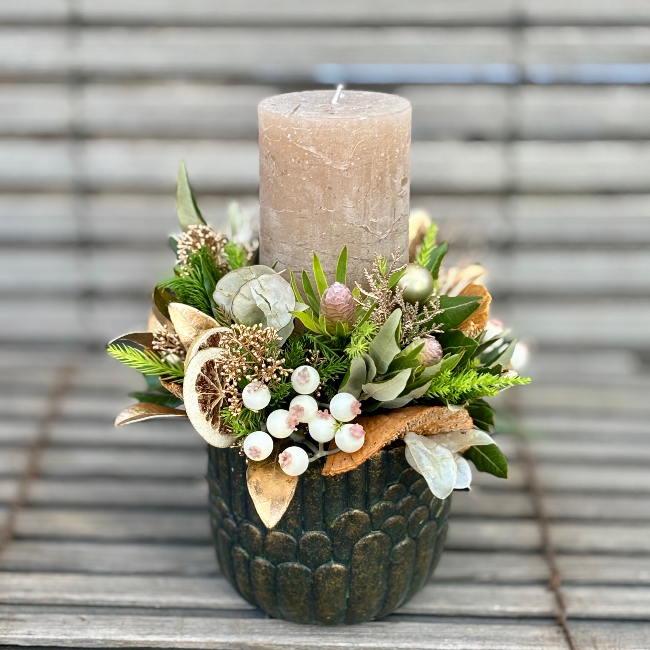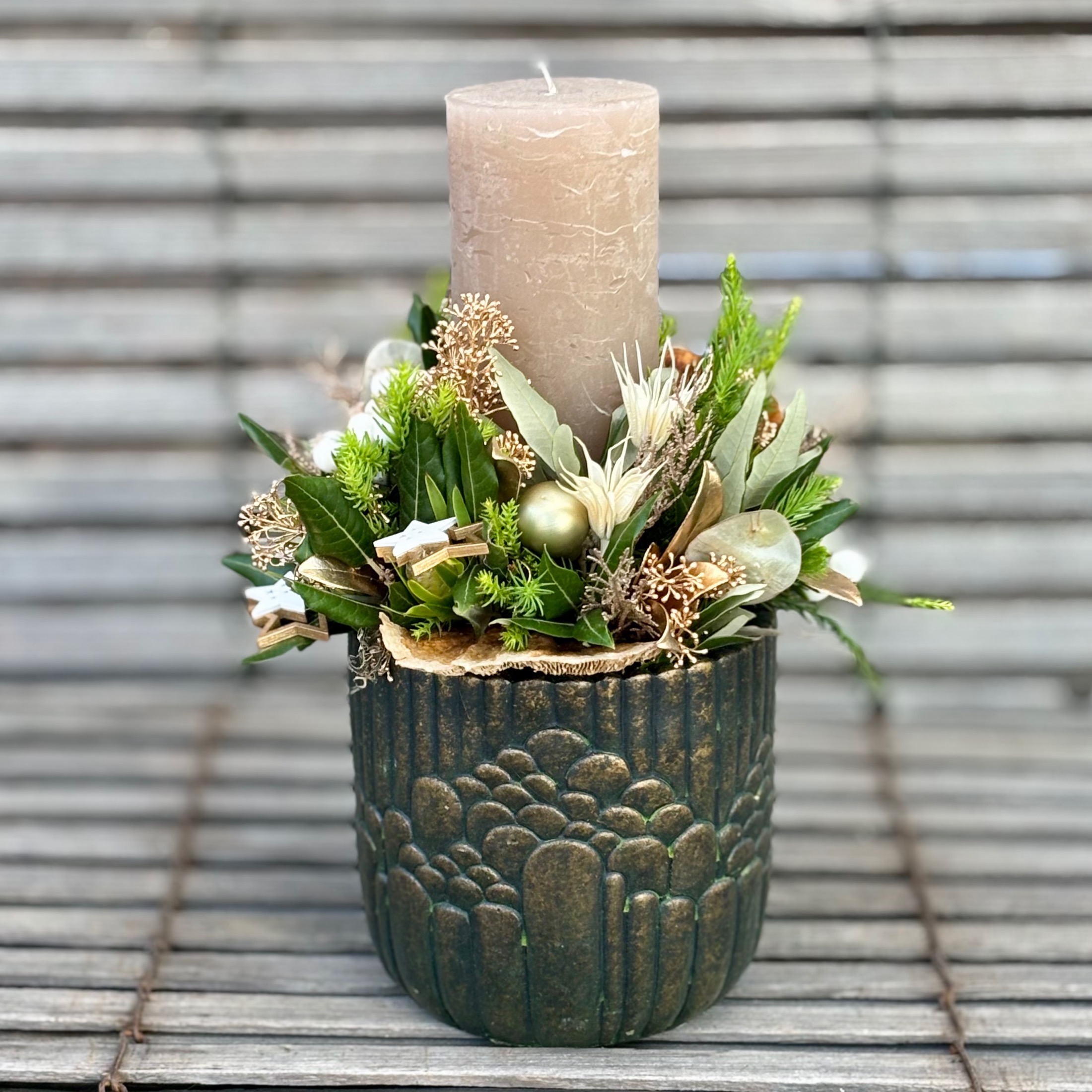 Gold-grüne Keramikserie befüllt mit Kerze, heimischen Koniferen und passender Deko.