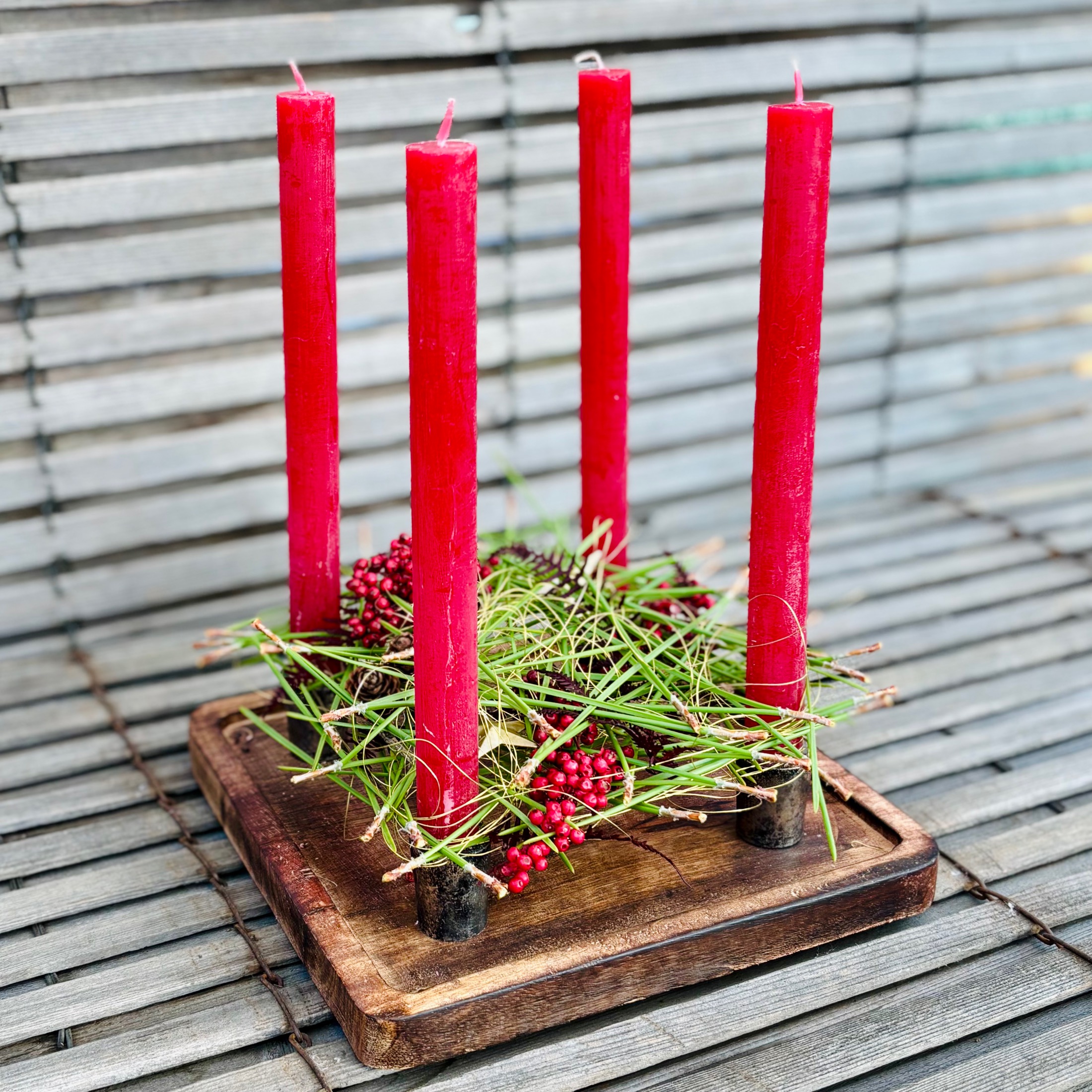 Kerzenhalter mit Piniennadeln und passender Deko.