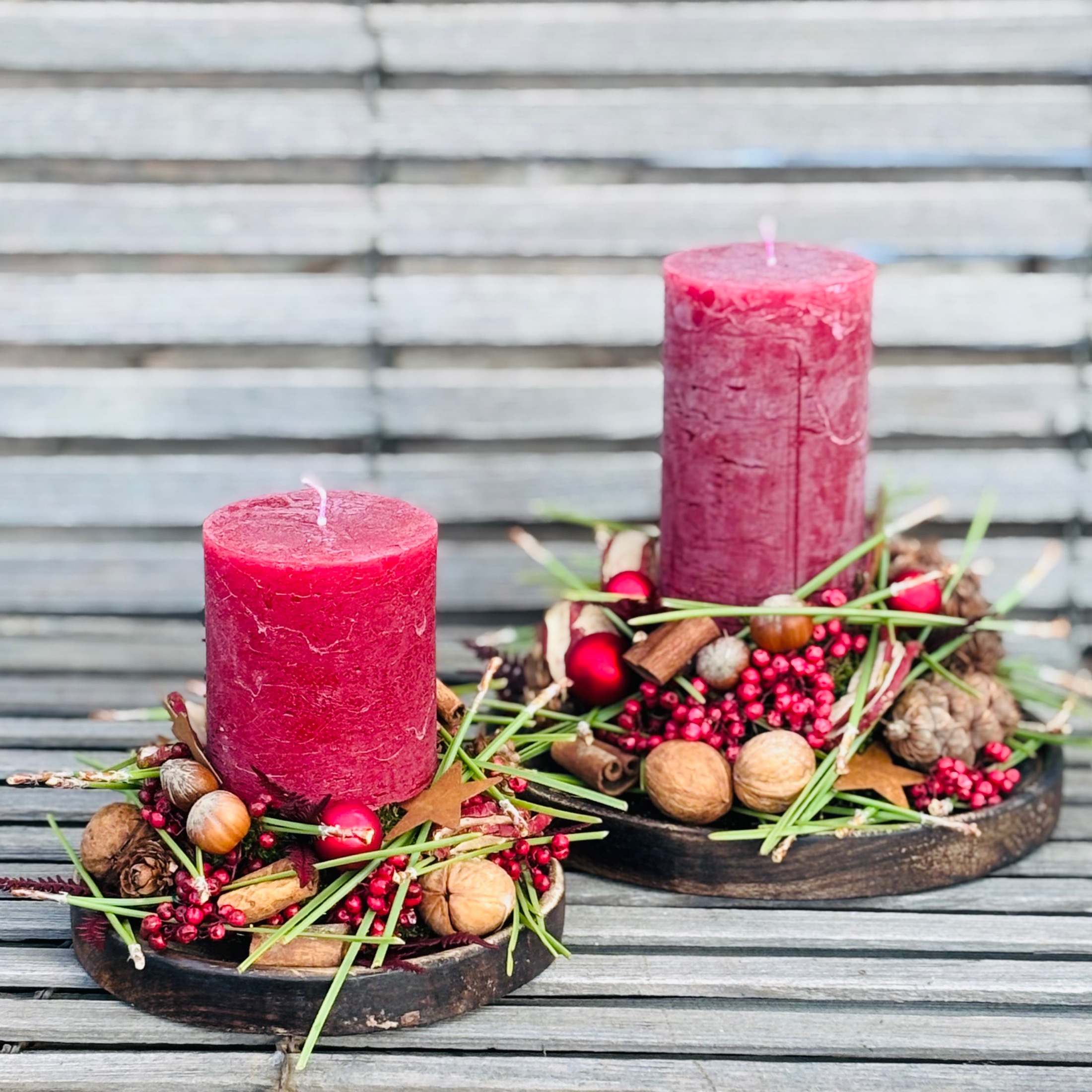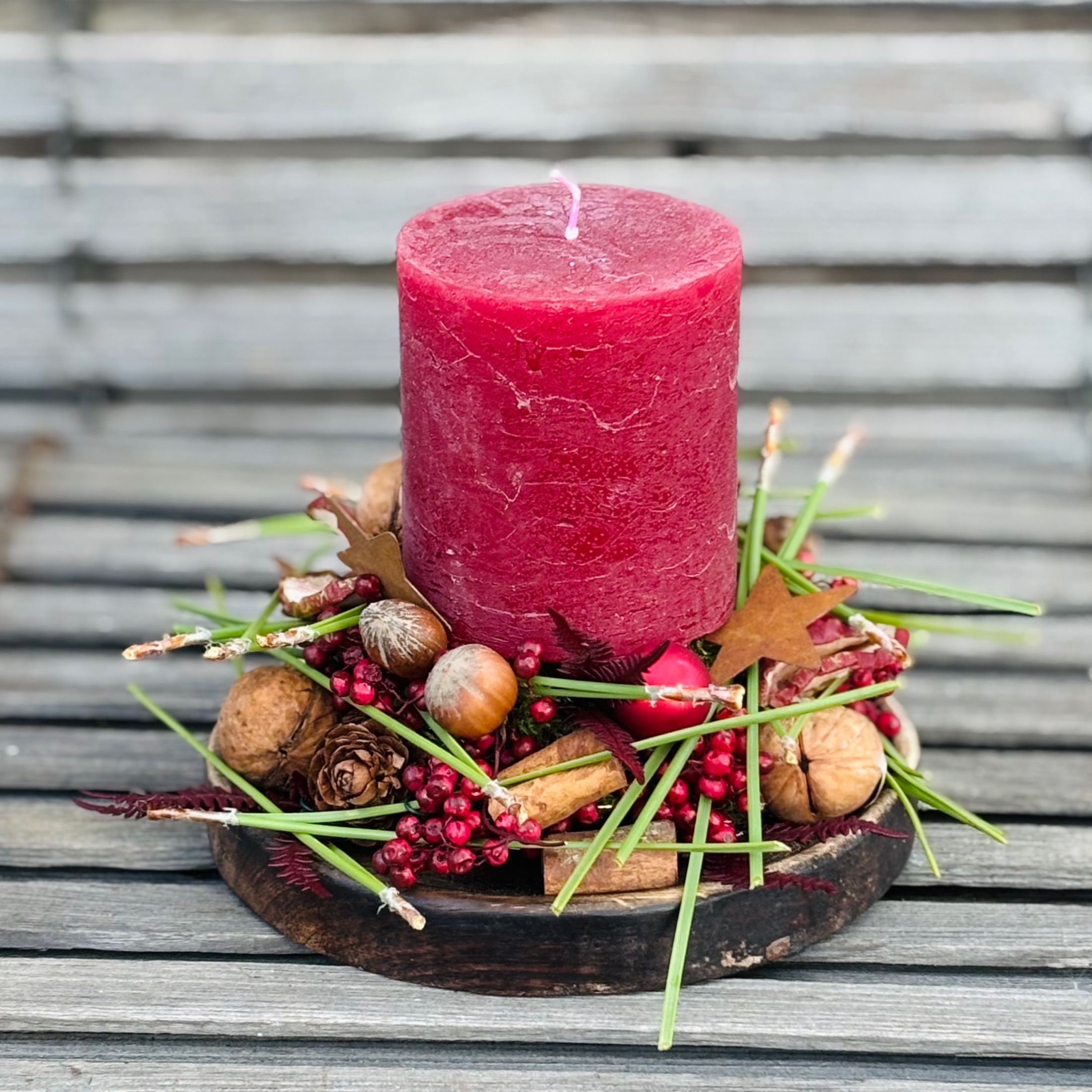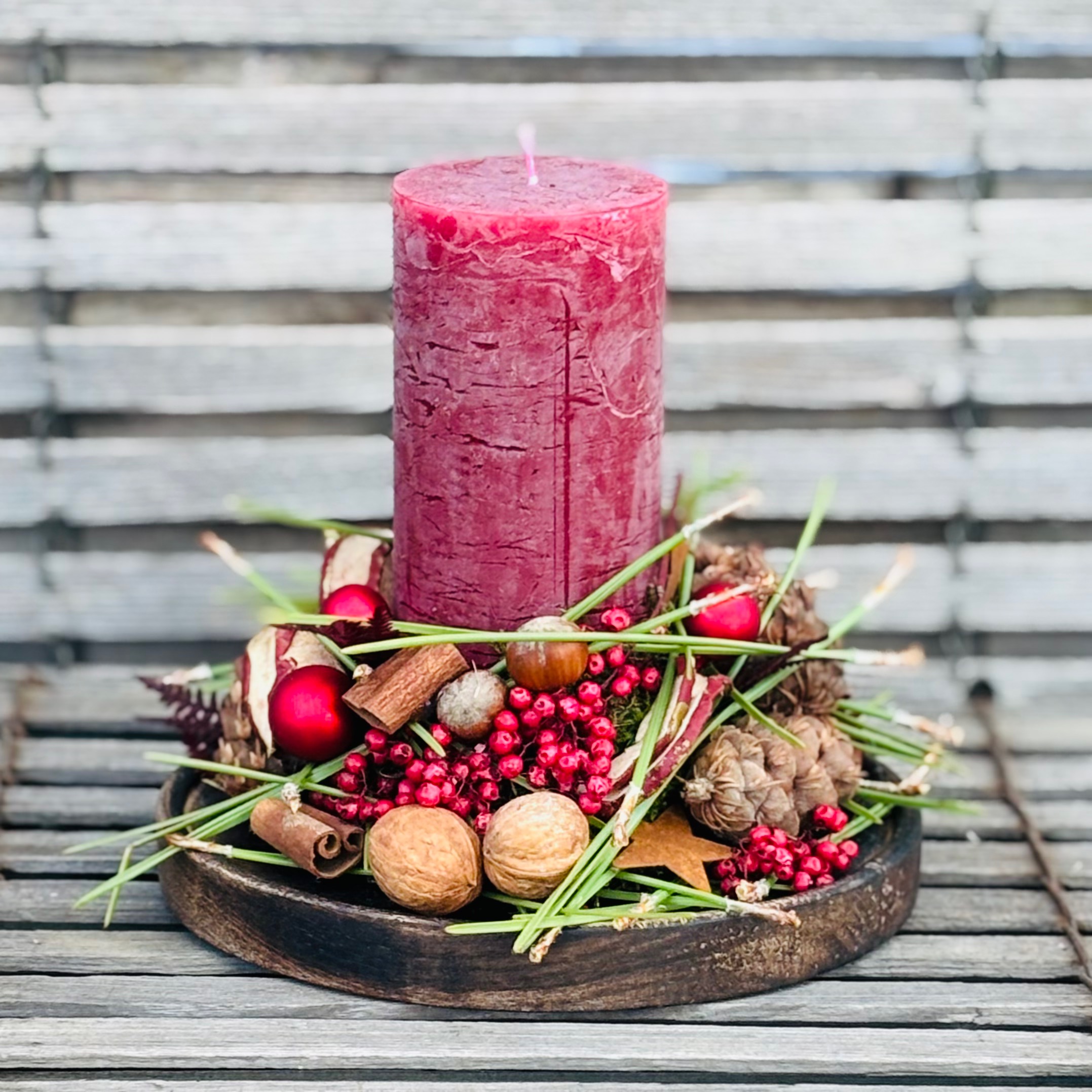 Holzteller mit Kerze, Piniennadel und passender Deko.