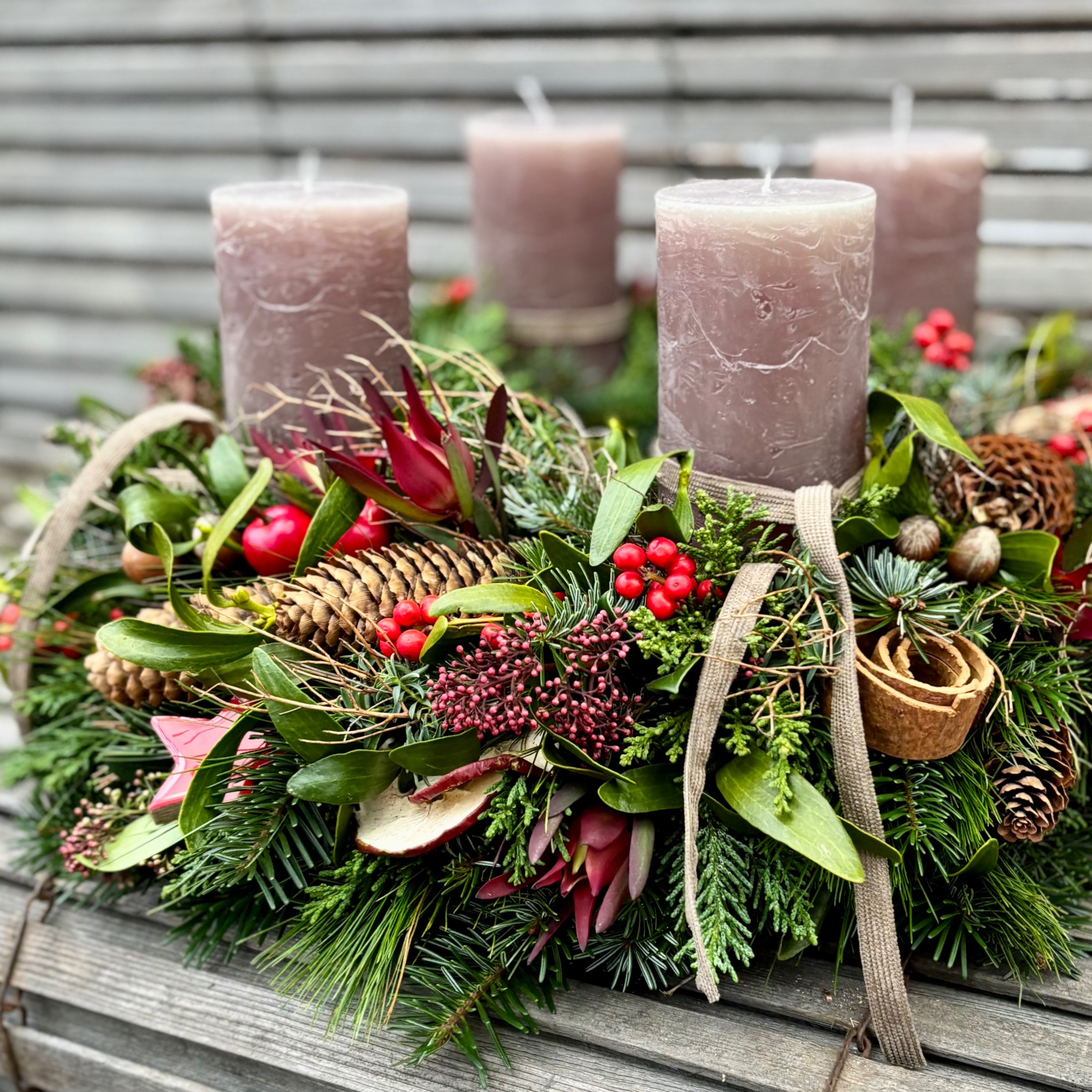 Adventkranz auf Steckschwammunterlage mit taupefärbigen Kerzen (120/70) und passender Deko.