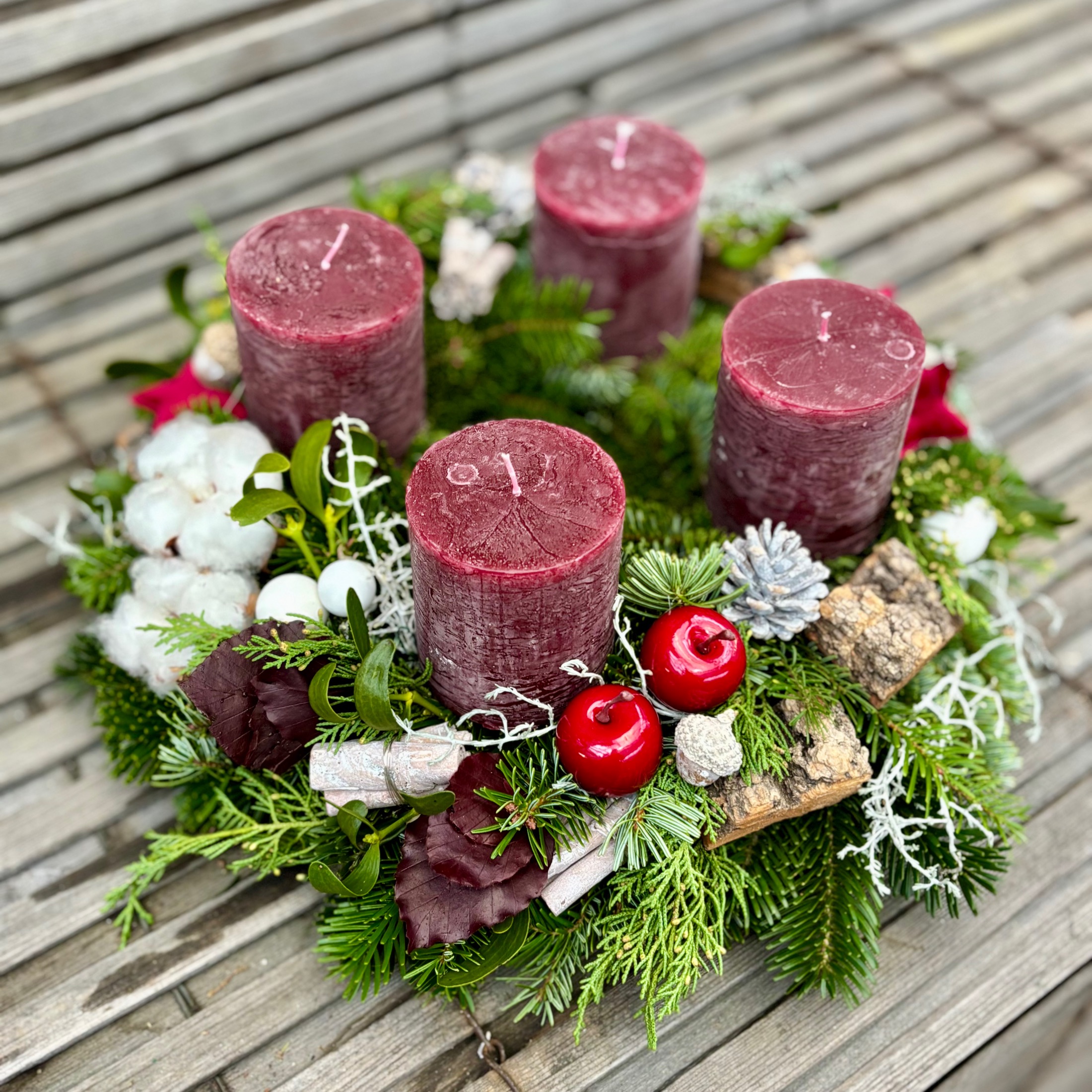 Gebundener Kranz aus Nordmanntanne (außen 35cm), durchgefärbte Kerzen (70/80) und passender Deko.