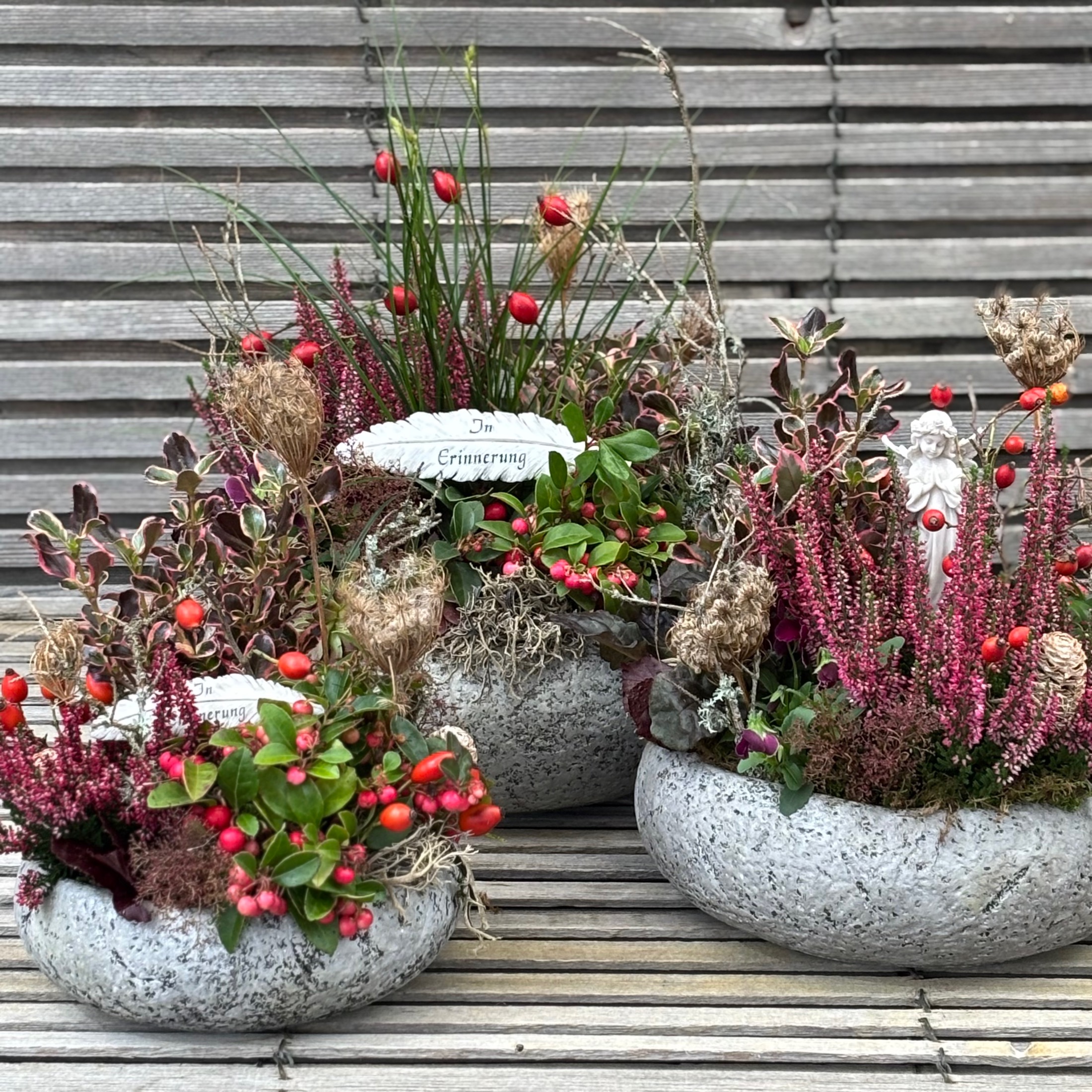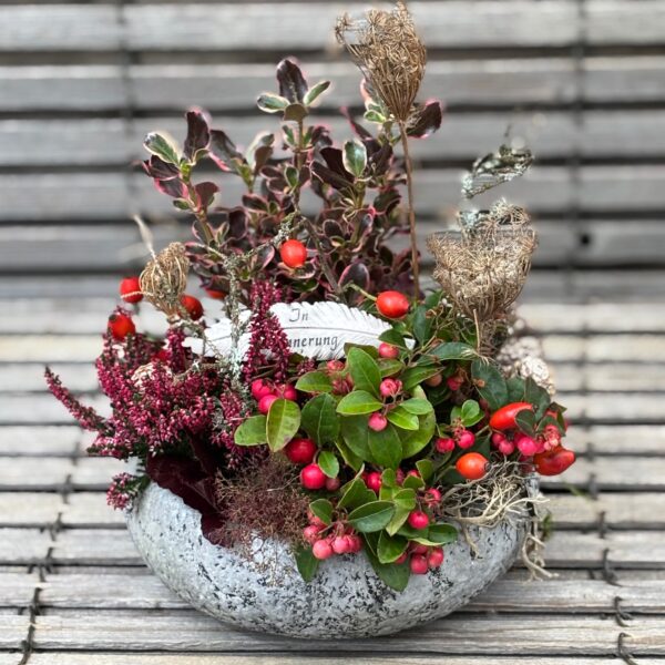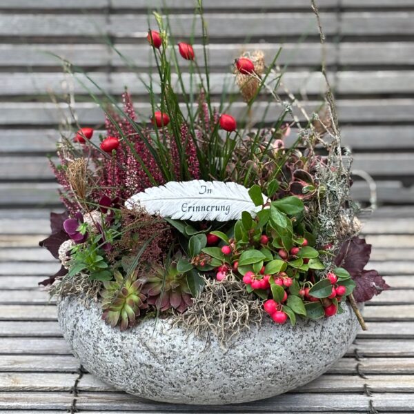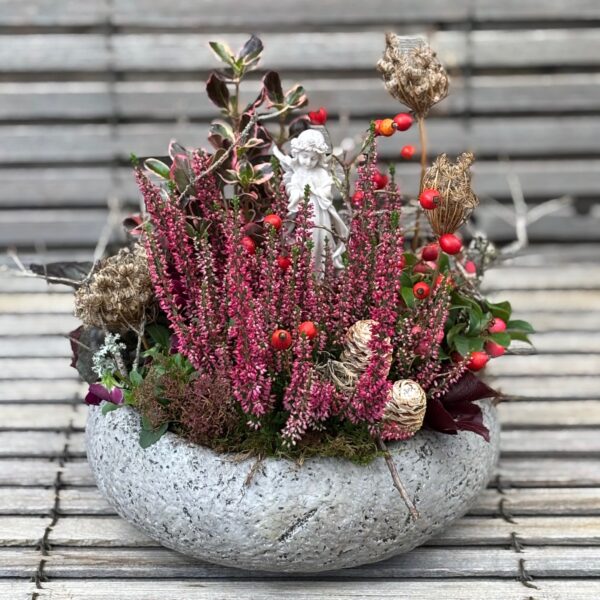 Keramikschale in Steinoptik befüllt mit saisonaler Bepflanzung und passender Deko.