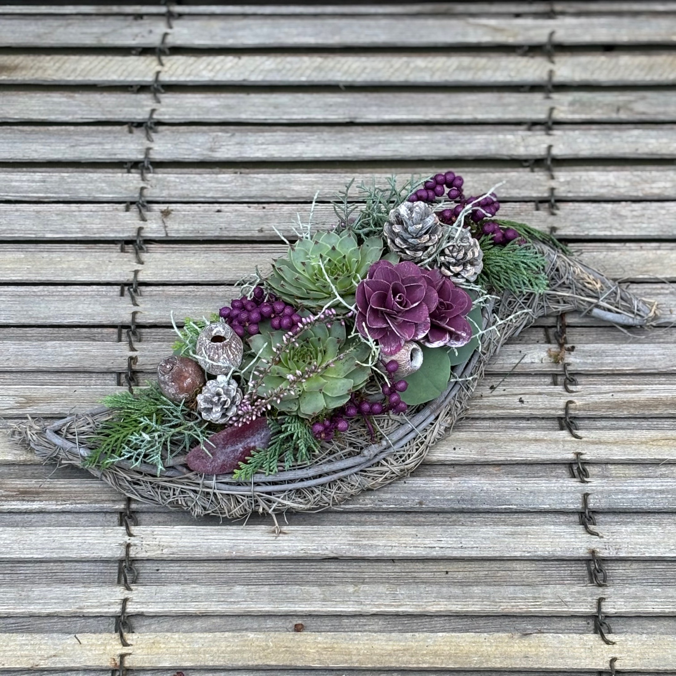Rebengefäß in Wellenform befüllt mit saisonaler Bepflanzung und passender Deko.