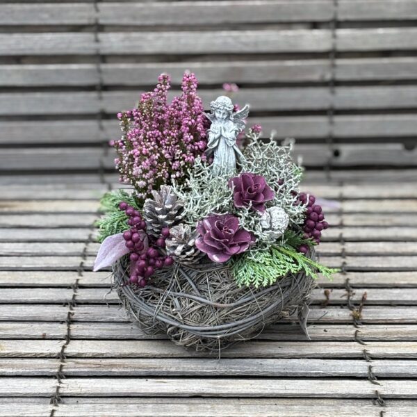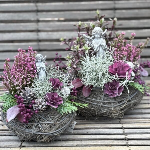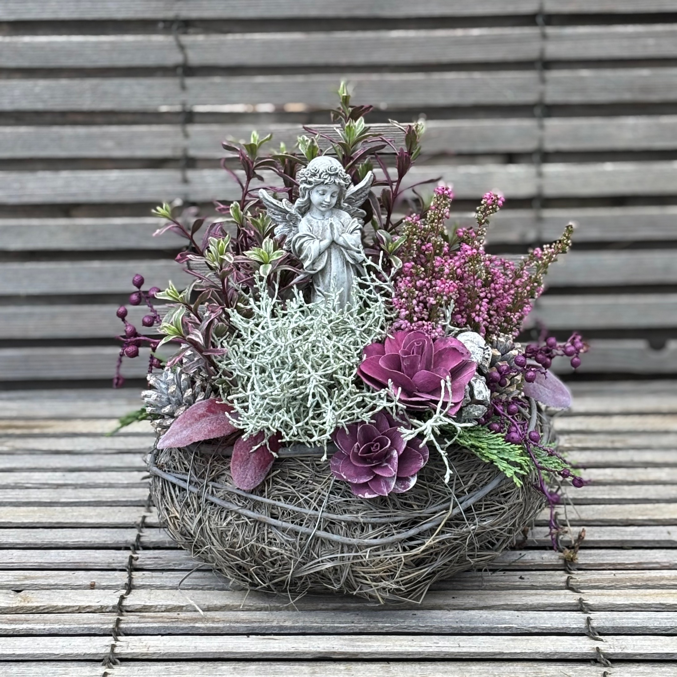 Rebenschale befüllt mit saisonaler Bepflanzung und passender Deko.
