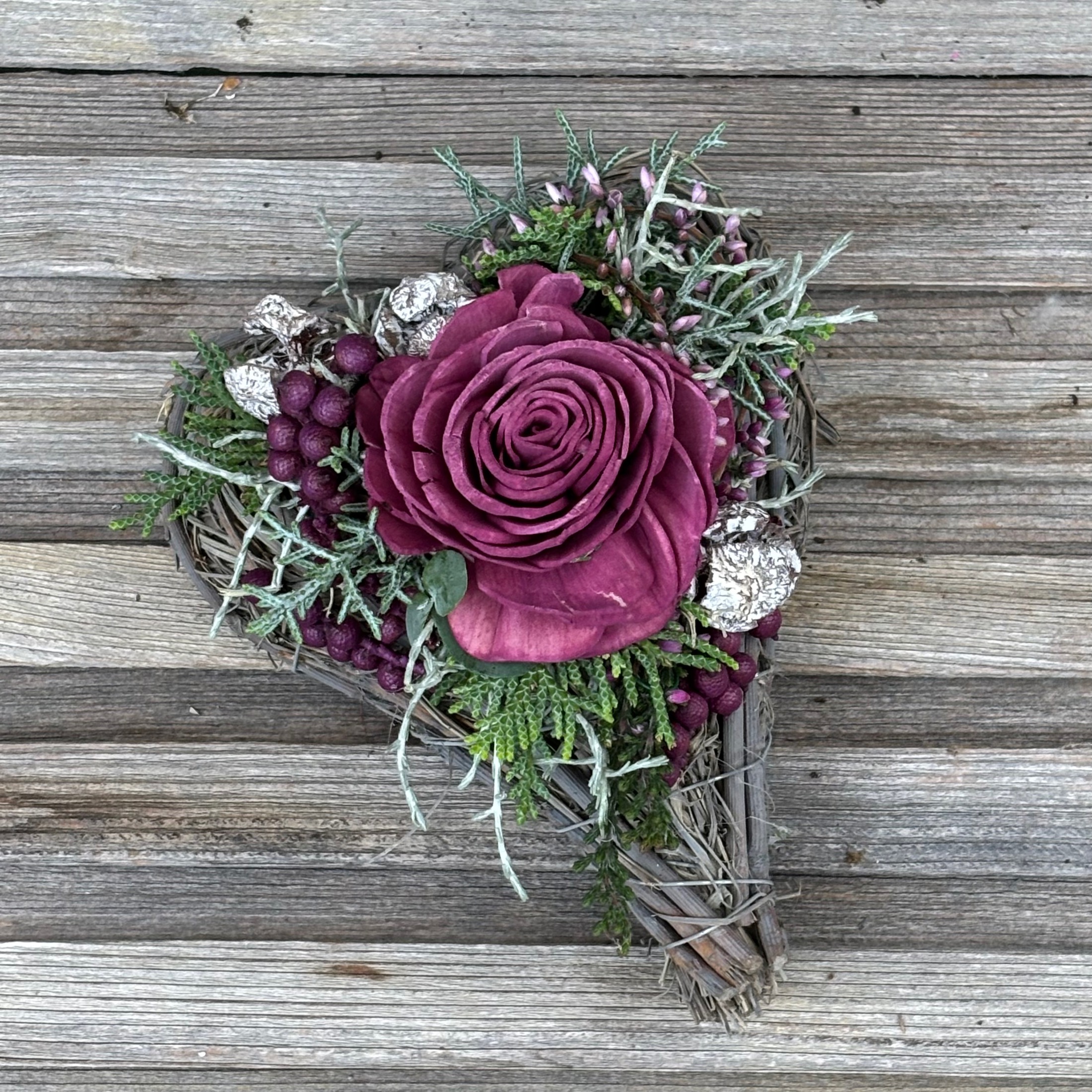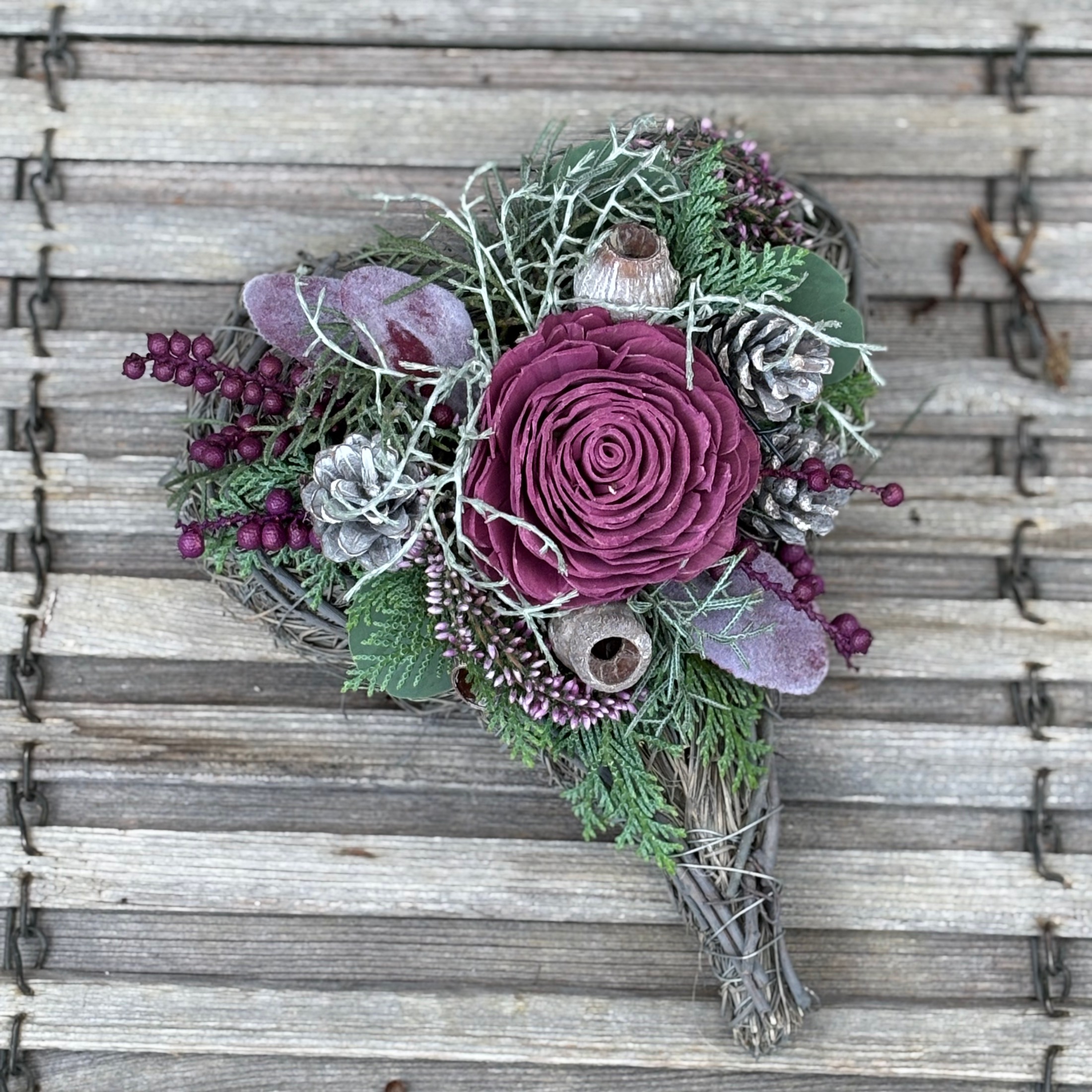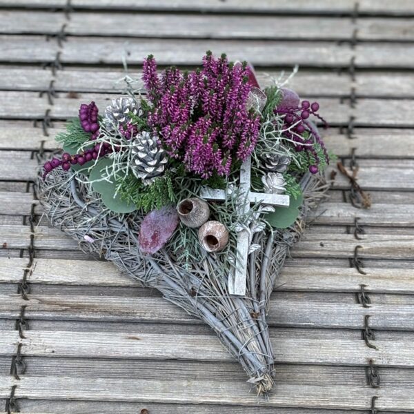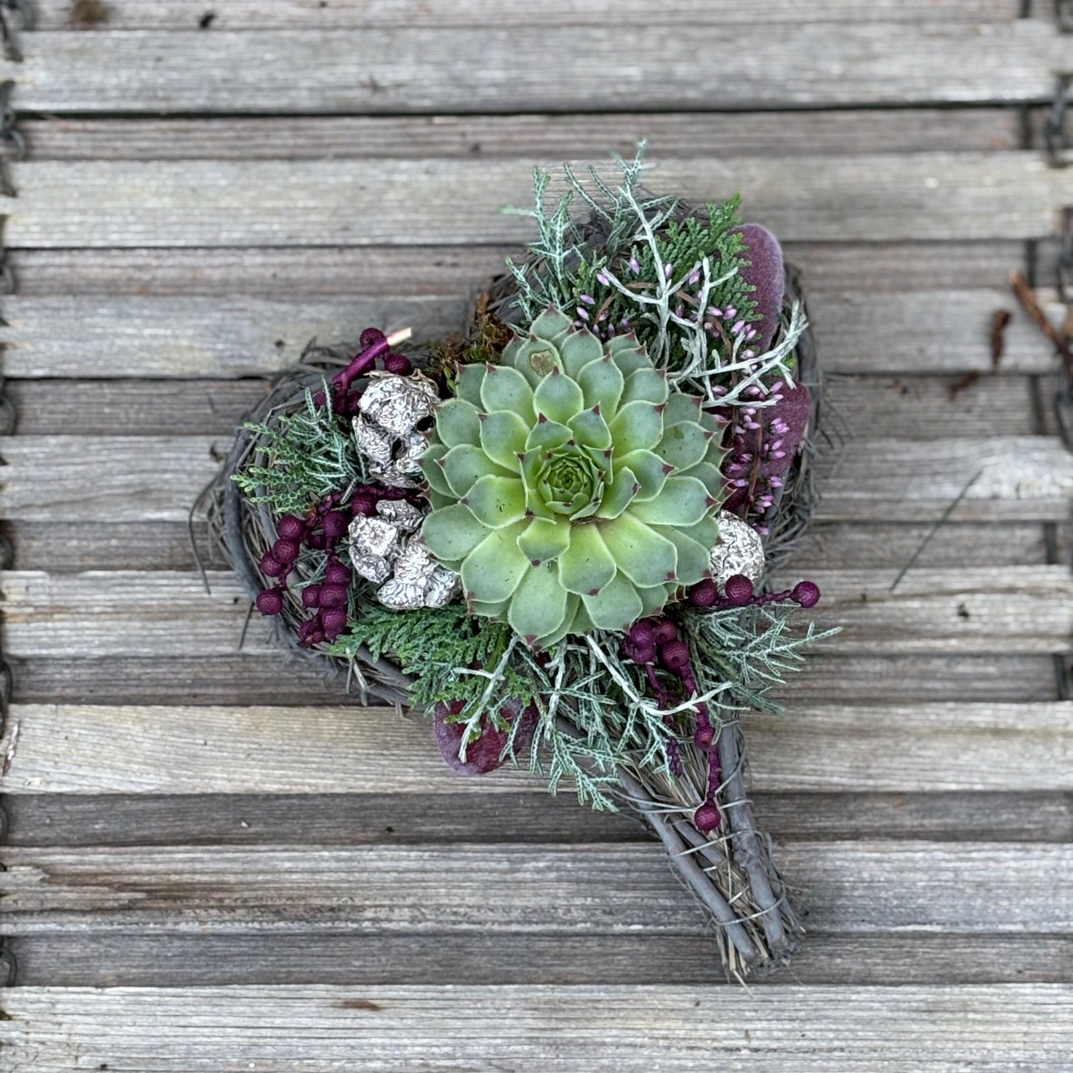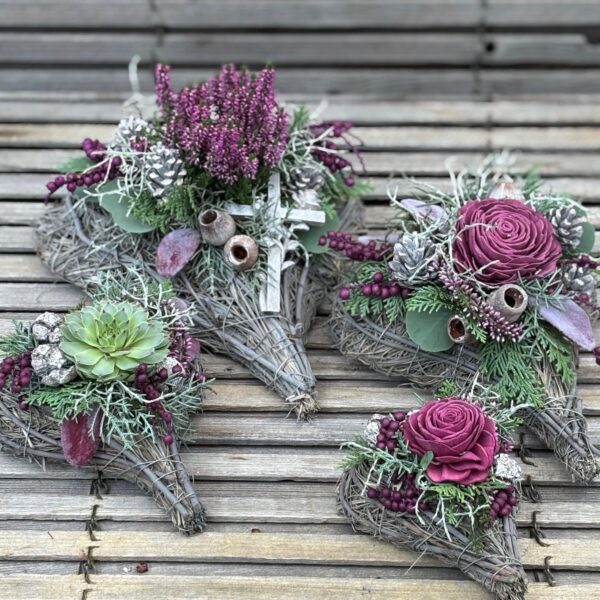 Rebengefäß in Herzform befüllt mit saisonaler Bepflanzung und passender Deko.