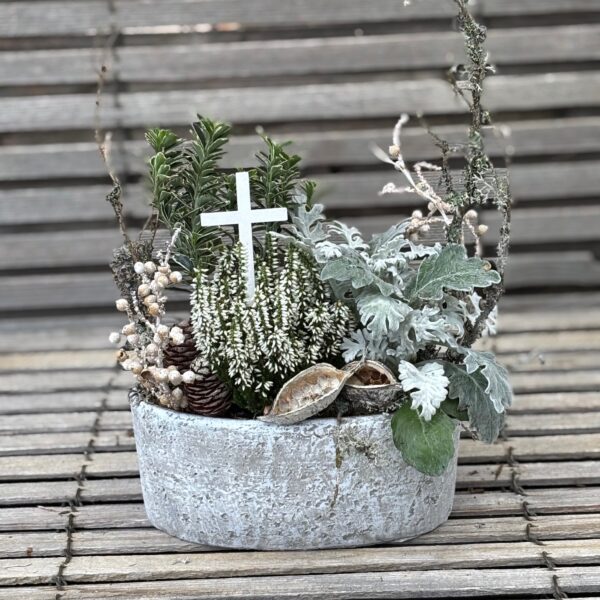 Betonschale befüllt saisonalen Pflanzen und passender Deko.