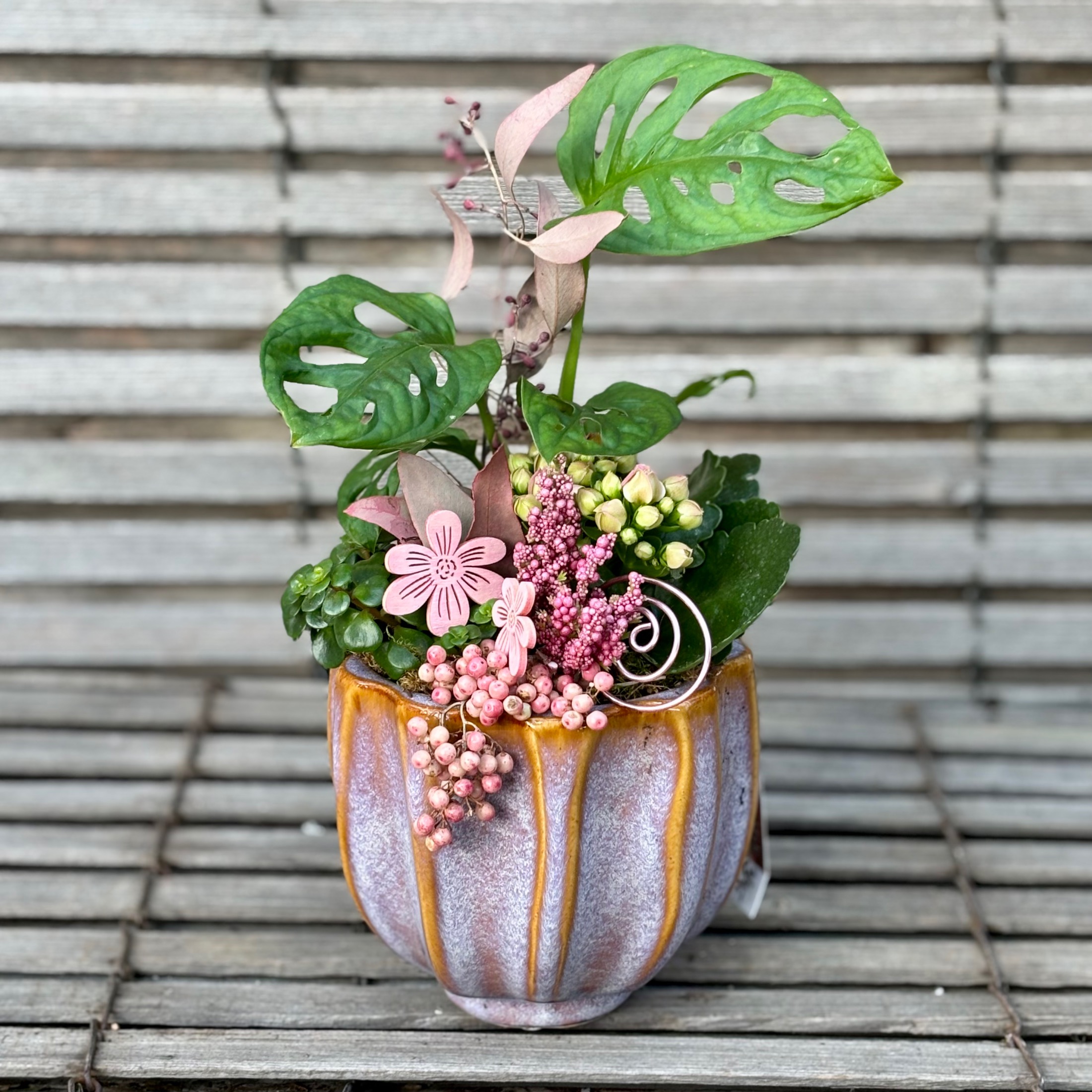 Dekoratives Keramikgefäß mit gemischten Zimmerpflanzen und passender Deko.