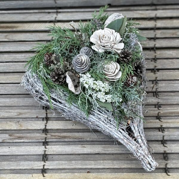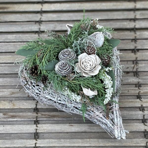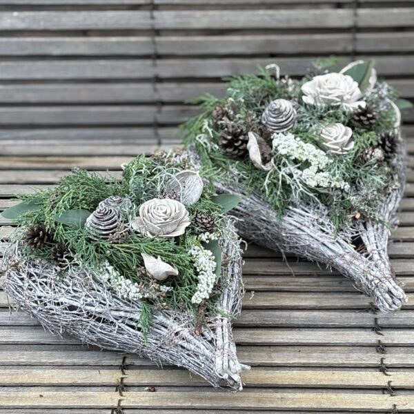 Rebengefäß in Herzform befüllt haltbarem Schnittgrün, Holzblüten und passender Deko.