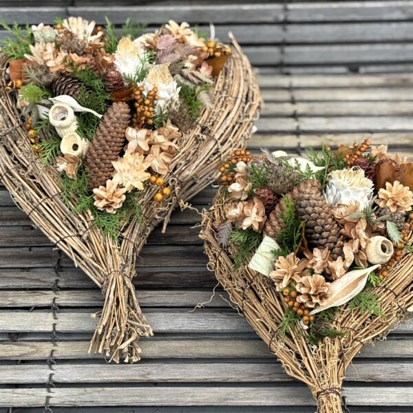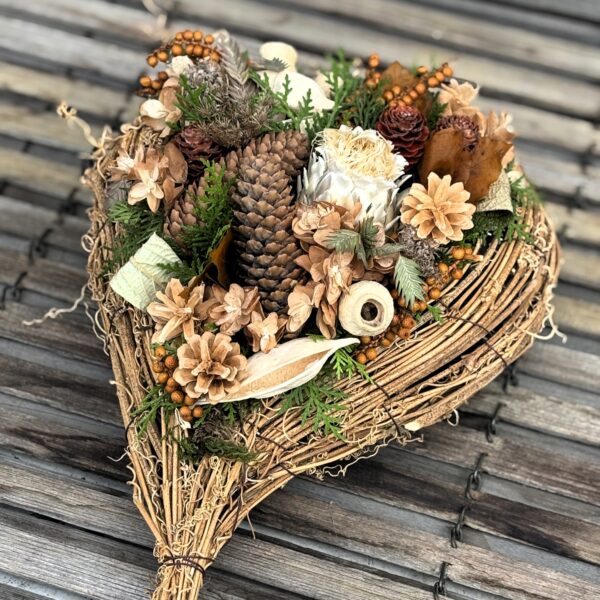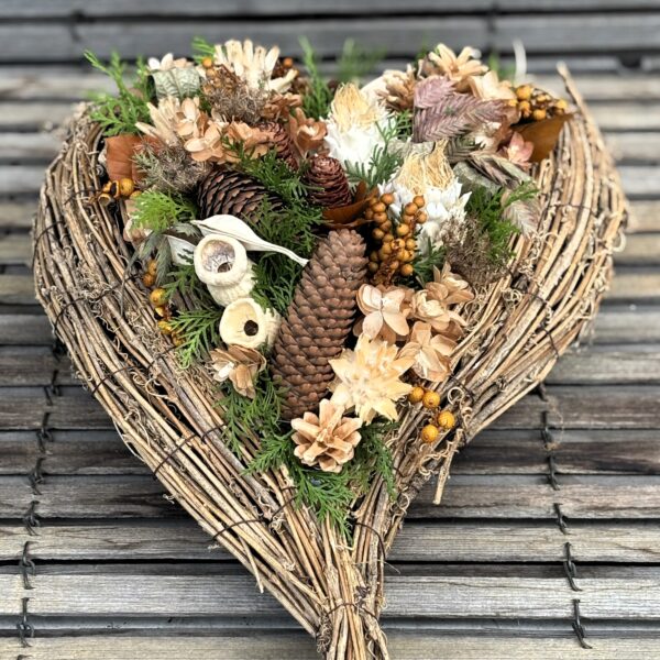 Gefäß aus brauner Rebe in Herzform mit Füllung aus Trockenblumen und Koniferen.