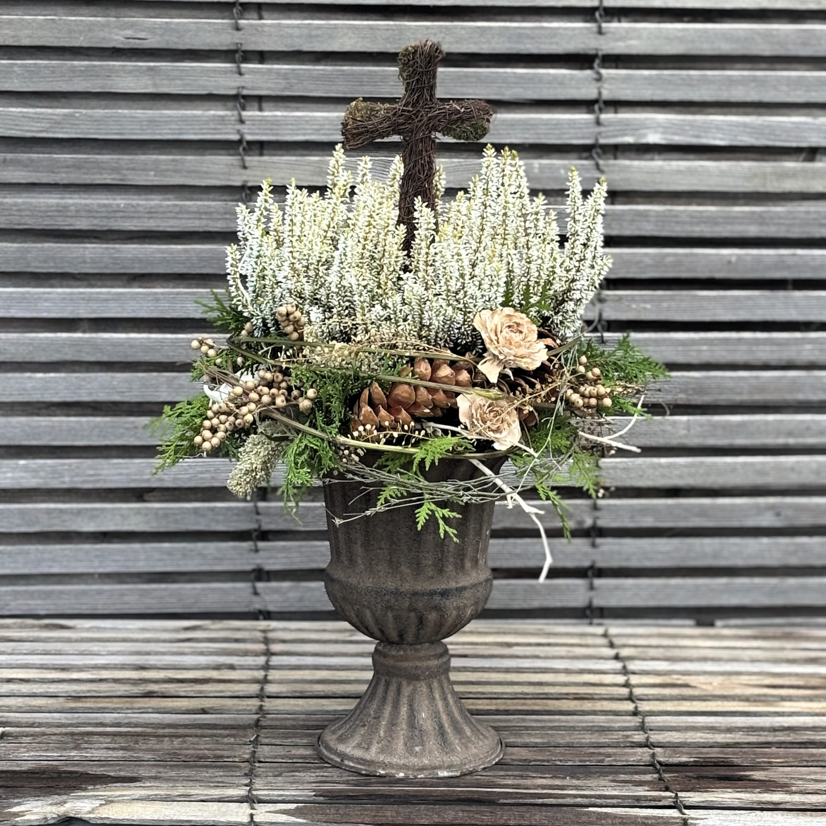 Brauner Metallpokal gefüllt mit weißer Calluna und passender Deko.