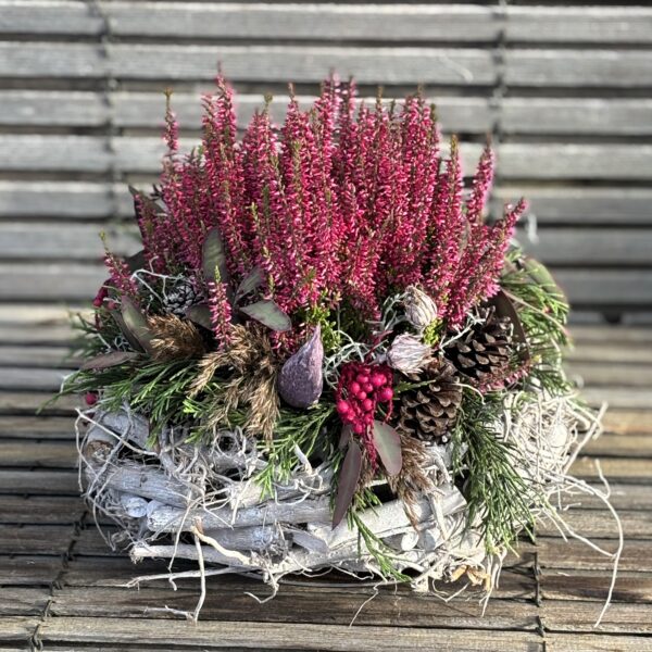 Holzring mit Calluna und Deko aus Trockenblumen und Koniferen.