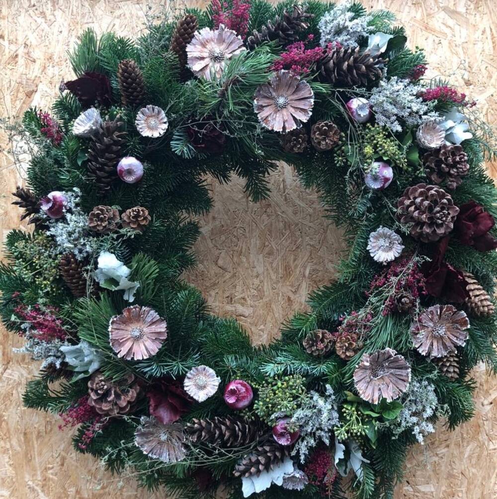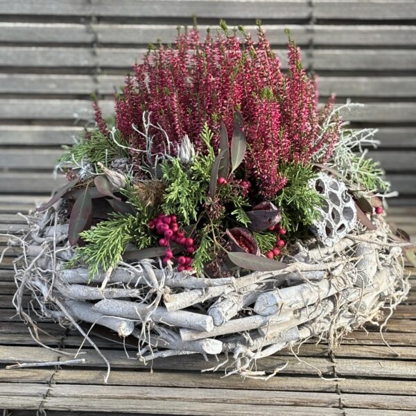 Holzring mit Calluna und Deko aus Trockenblumen und Koniferen.