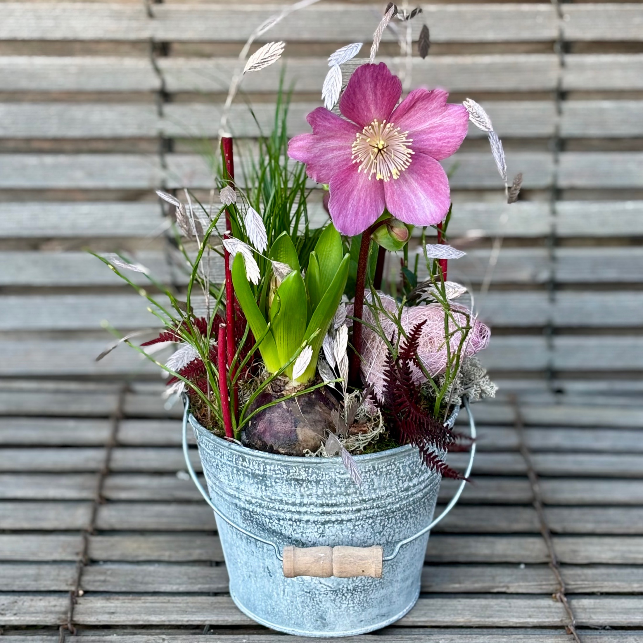Zinkgefäß mit Schneerose, Gras und Hyazinthe.