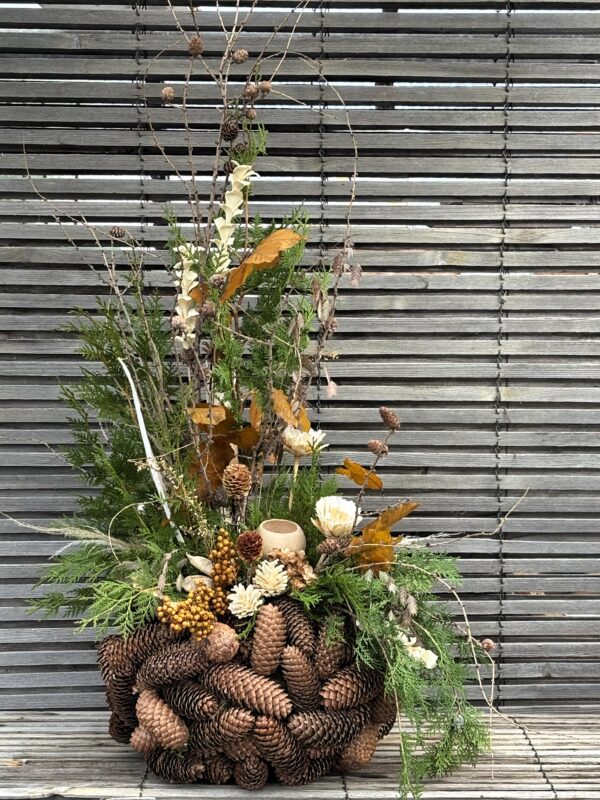 Gefäß aus Fichtenzapfen mit floraler Füllung aus Trockenblumen und Koniferen.