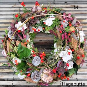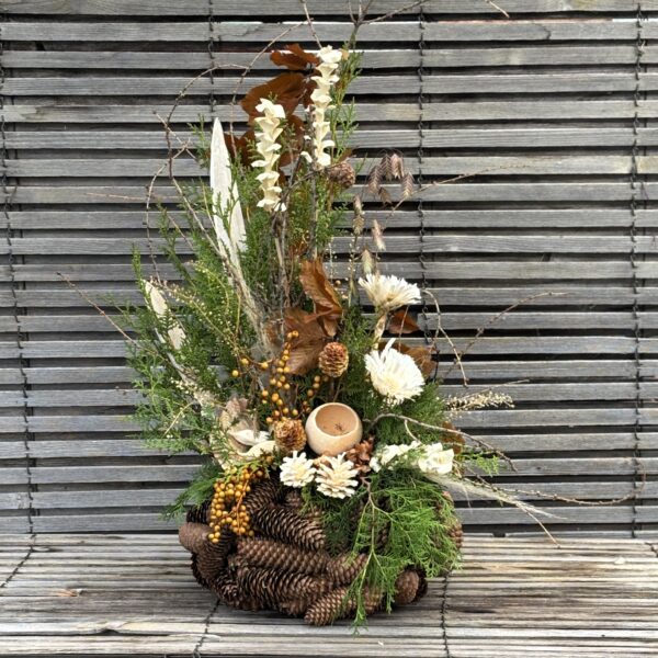 Gefäß aus Fichtenzapfen mit floraler Füllung aus Trockenblumen und Koniferen.
