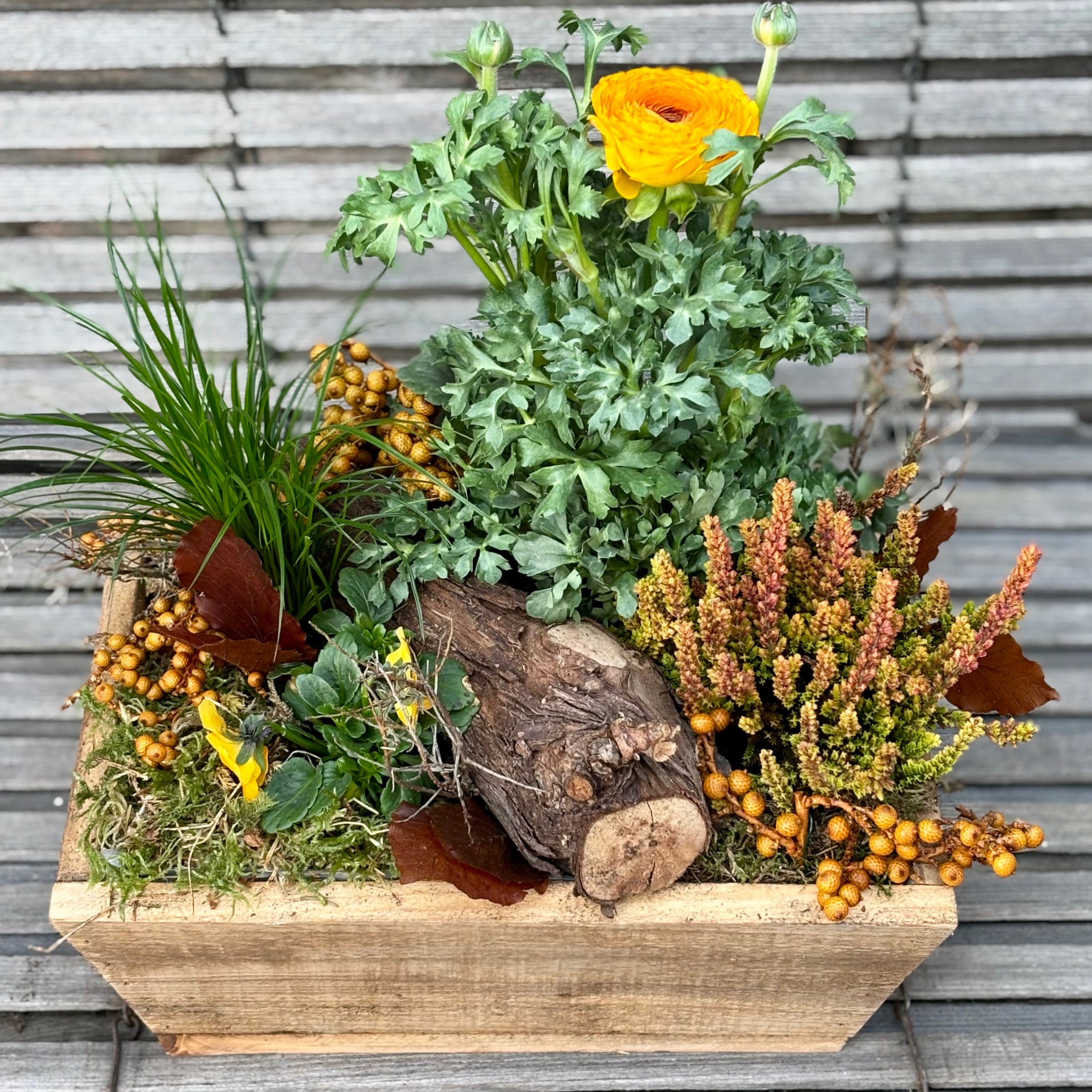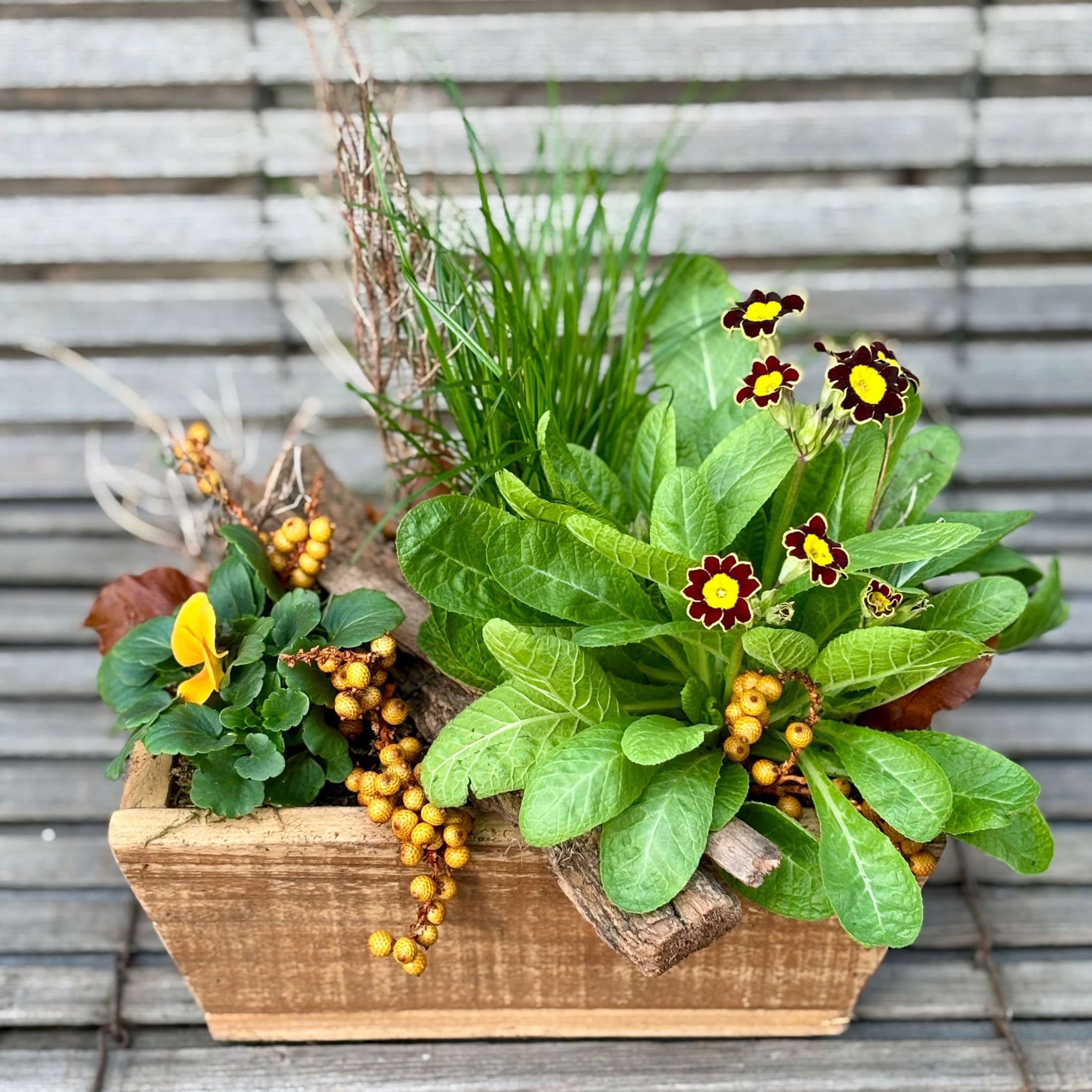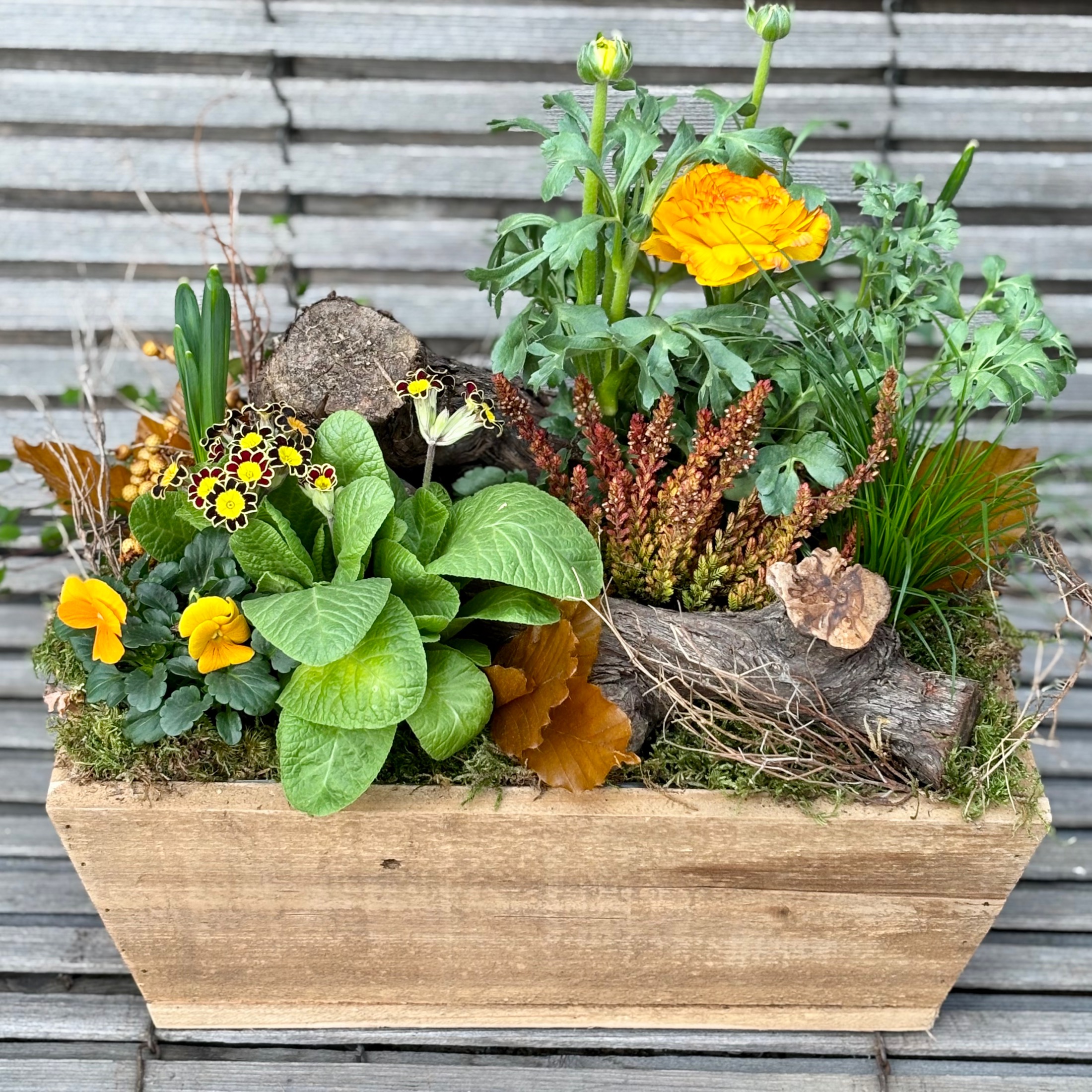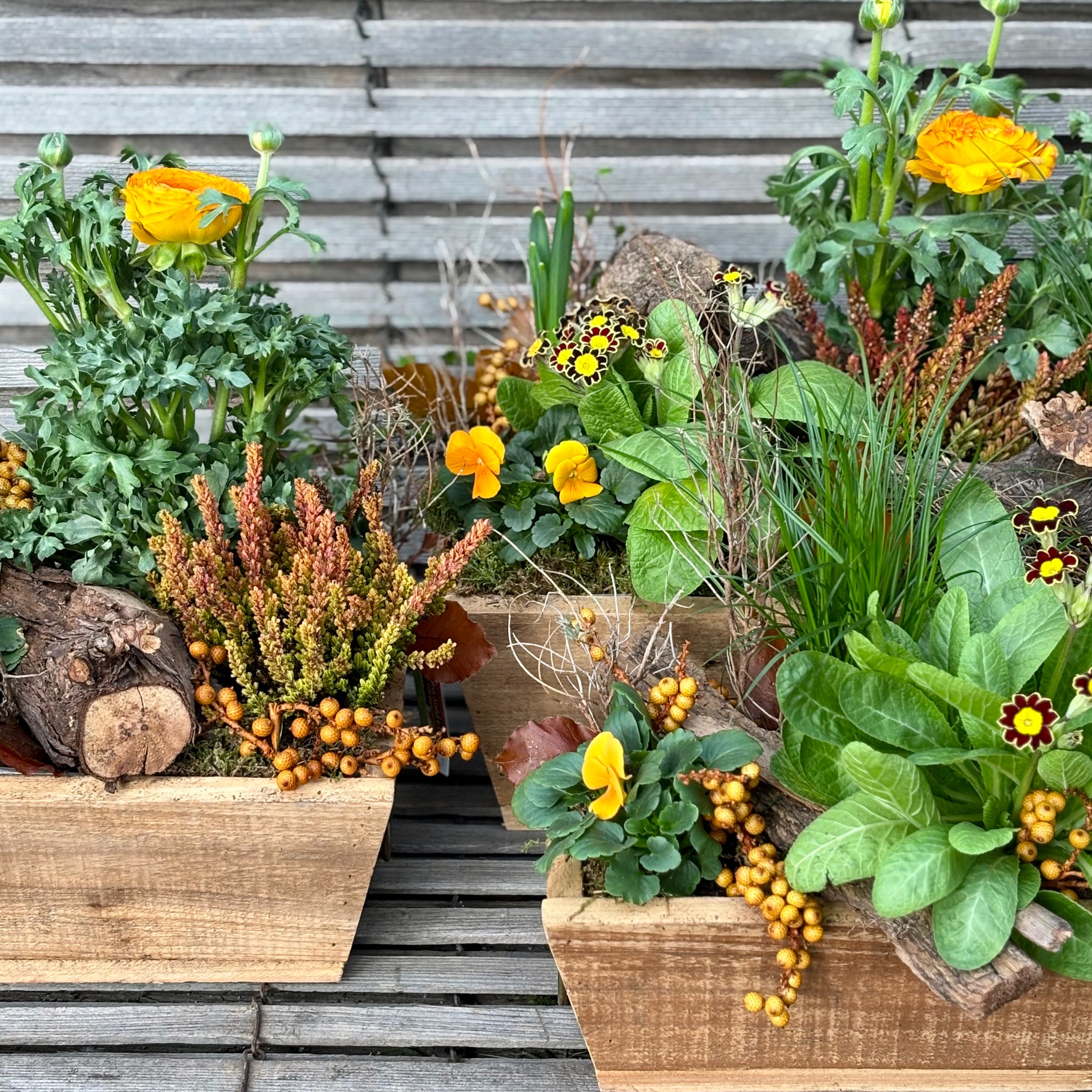 Holzwannen bepflanzt mit gemischten Frühlingsblühern und natürlicher Deko.