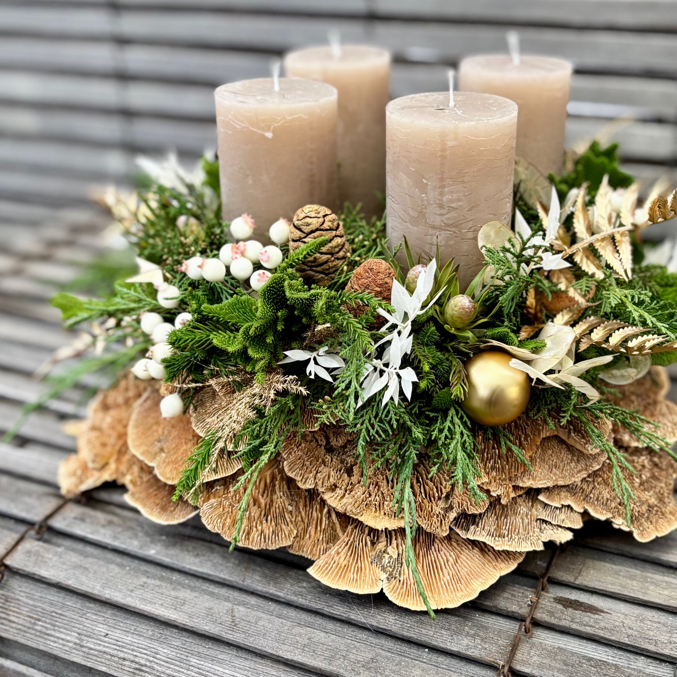 Adventkranz auf Steckschwammunterlage mit hellbraunen Kerzen (120/70) und passender Deko.