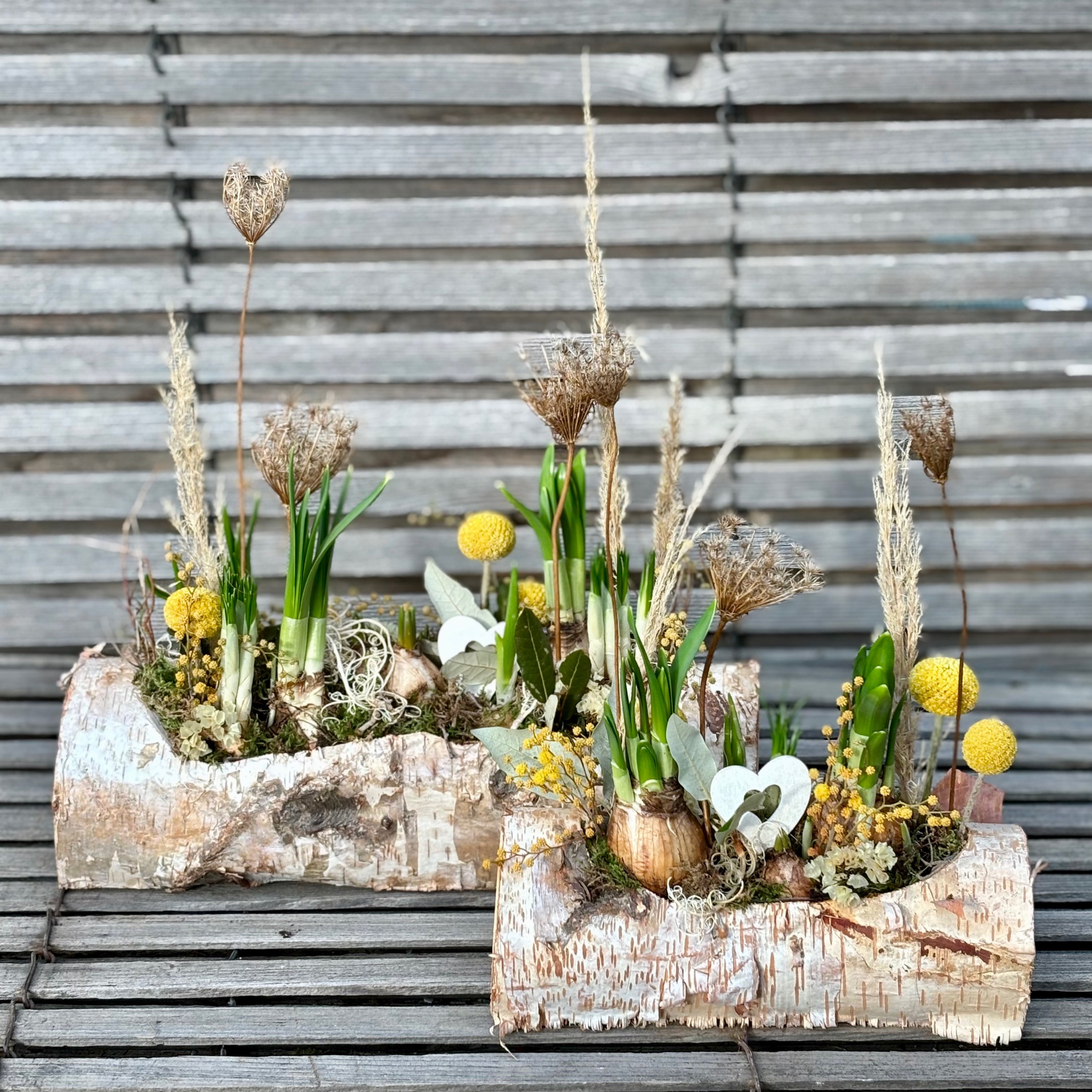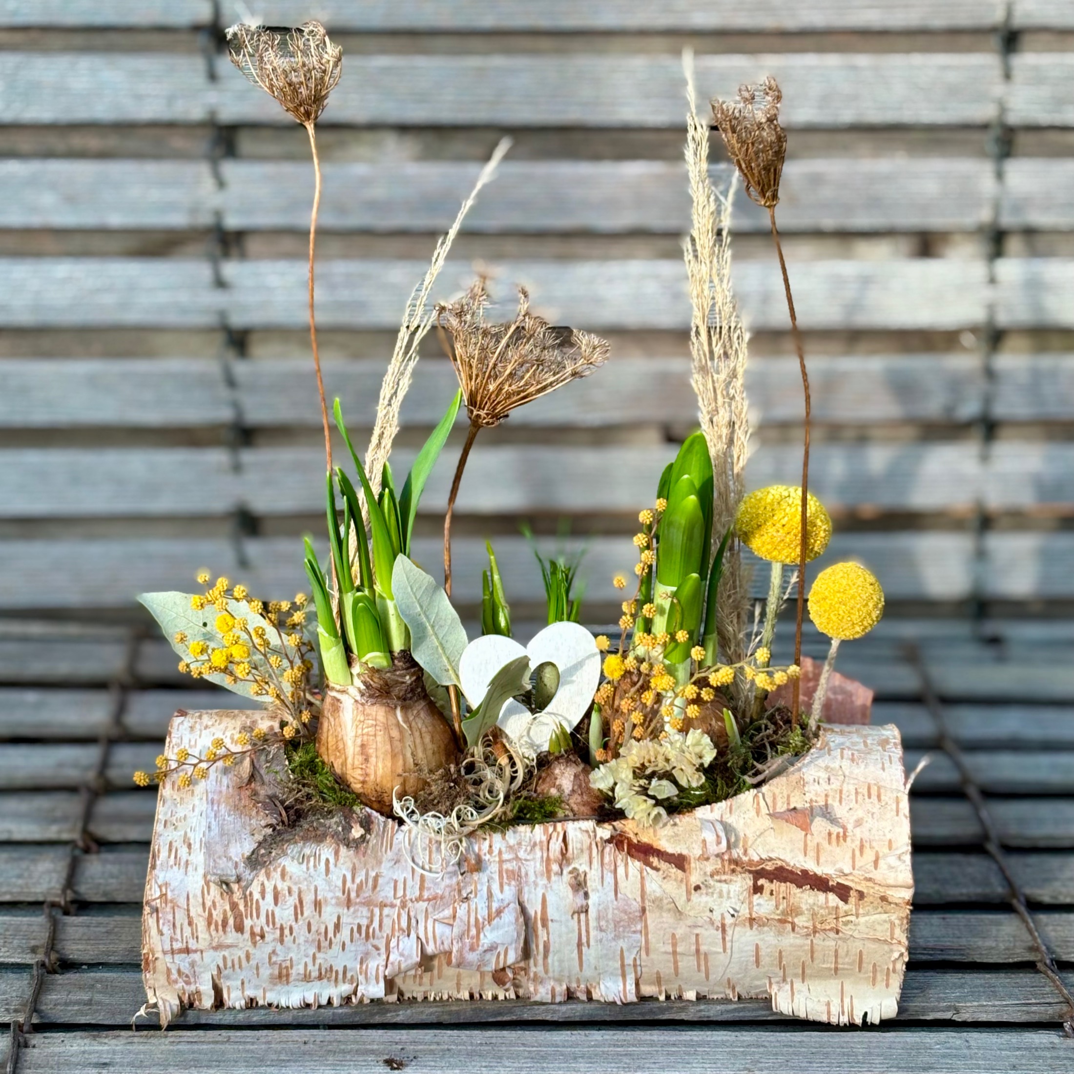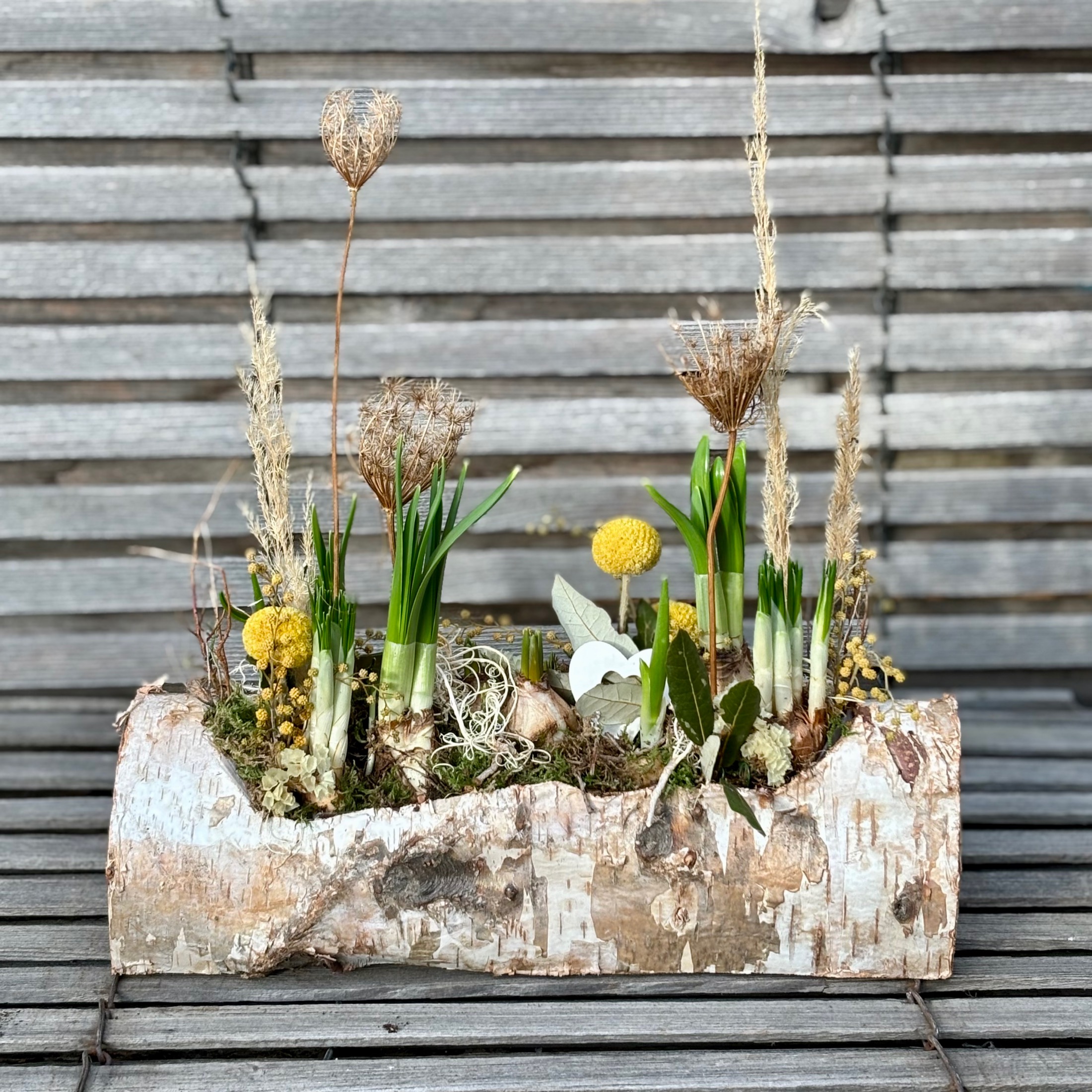 Baumstamm mit gelben und weißen Zwiebelpflanzen und floraler Deko.