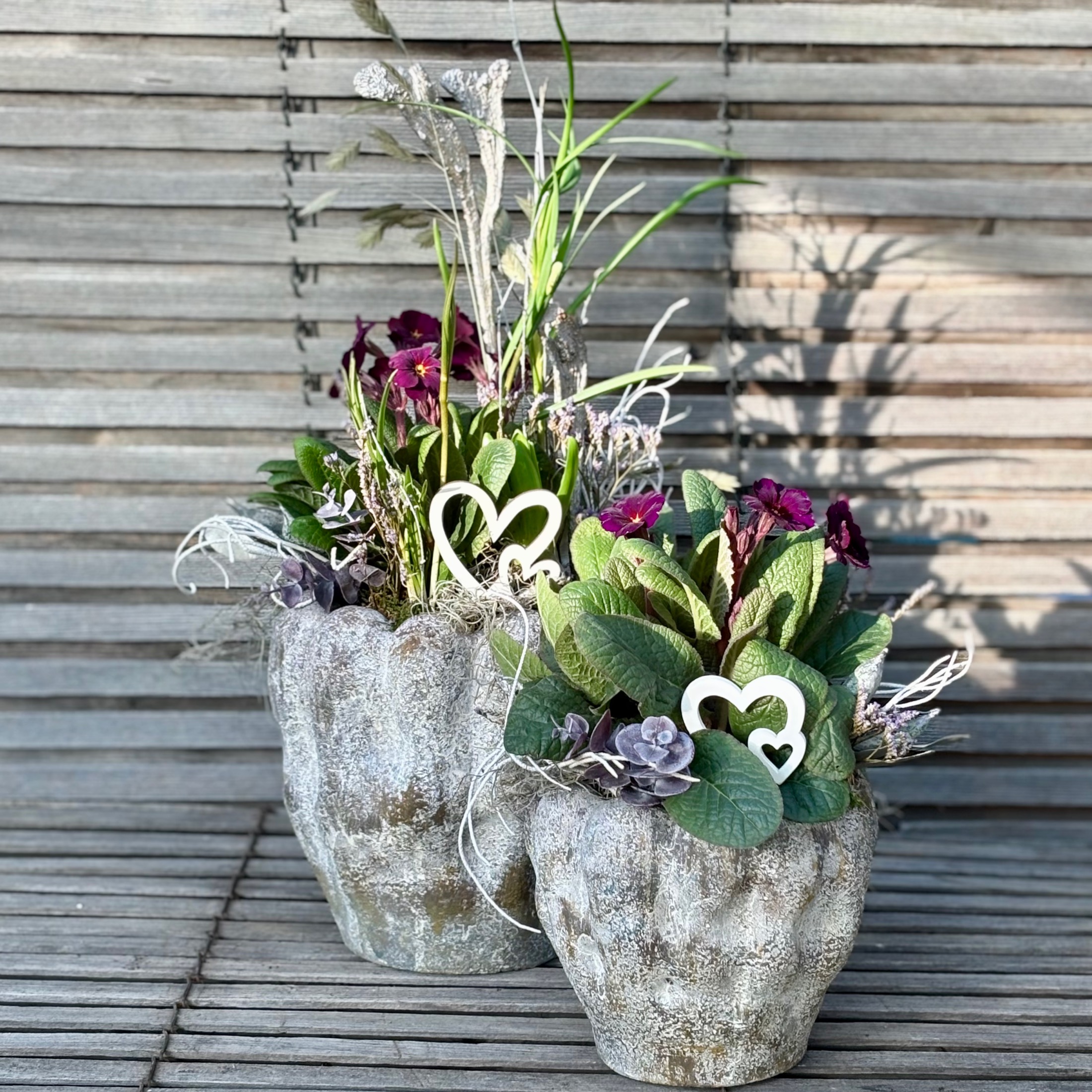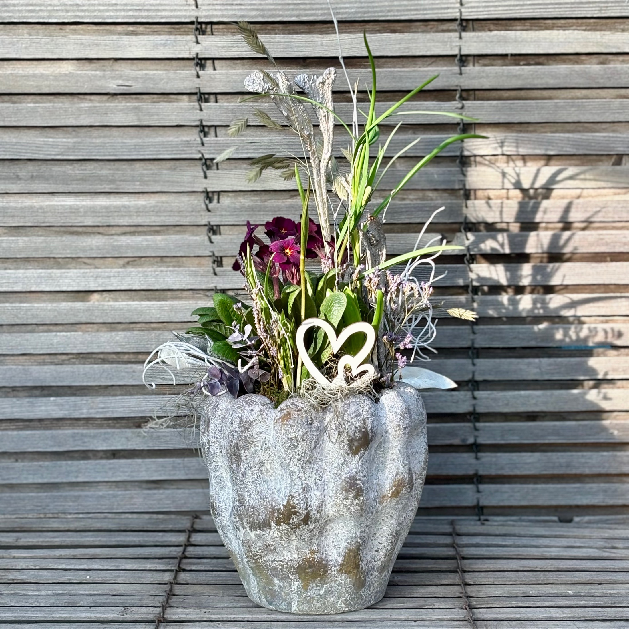 Massiver Keramiktopf mit dunkelvioletter Stielprimel und frühlingshafter Deko.