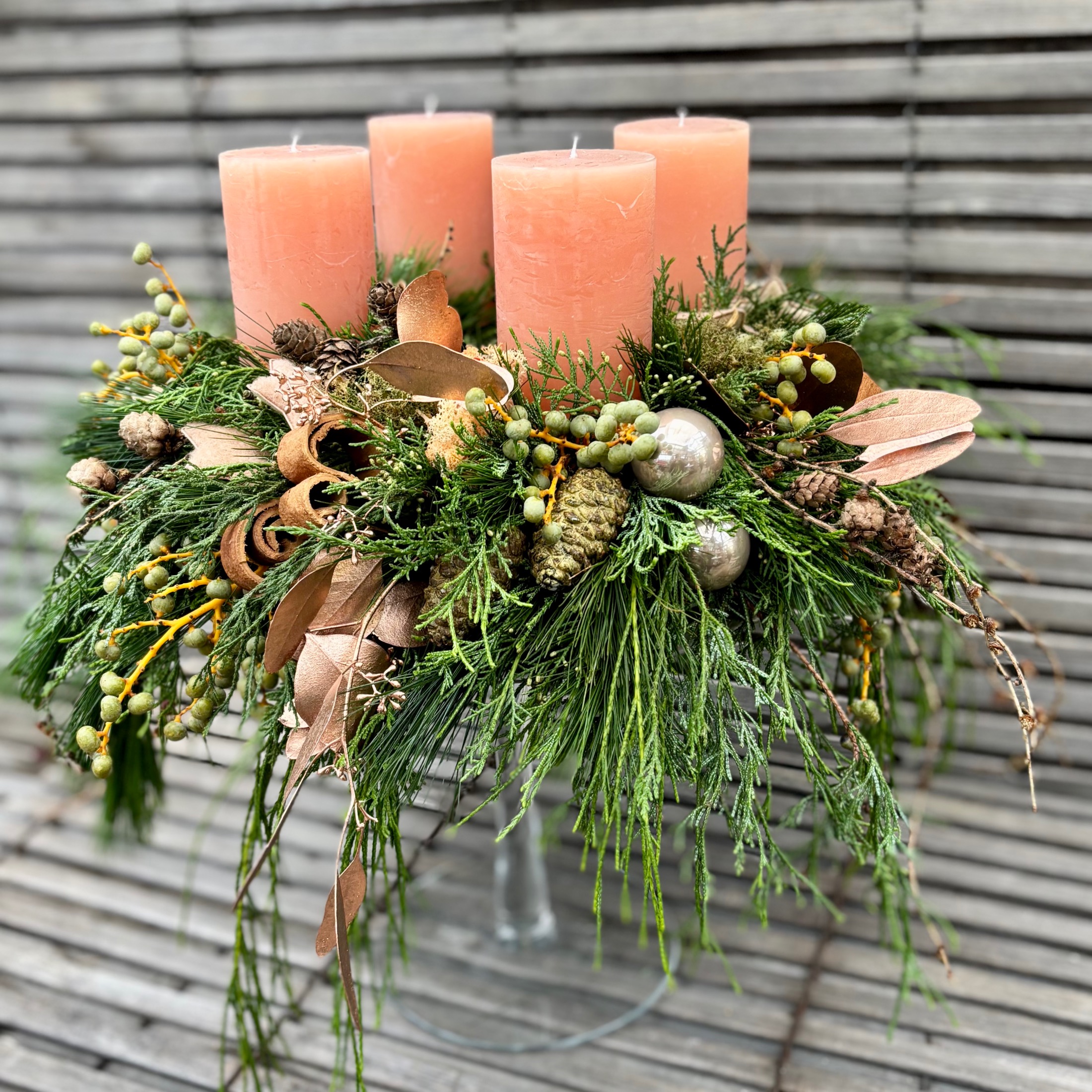 Adventkranz auf Steckschwammunterlage mit durchgefärbten Kerzen (120/70) und passender Deko.
