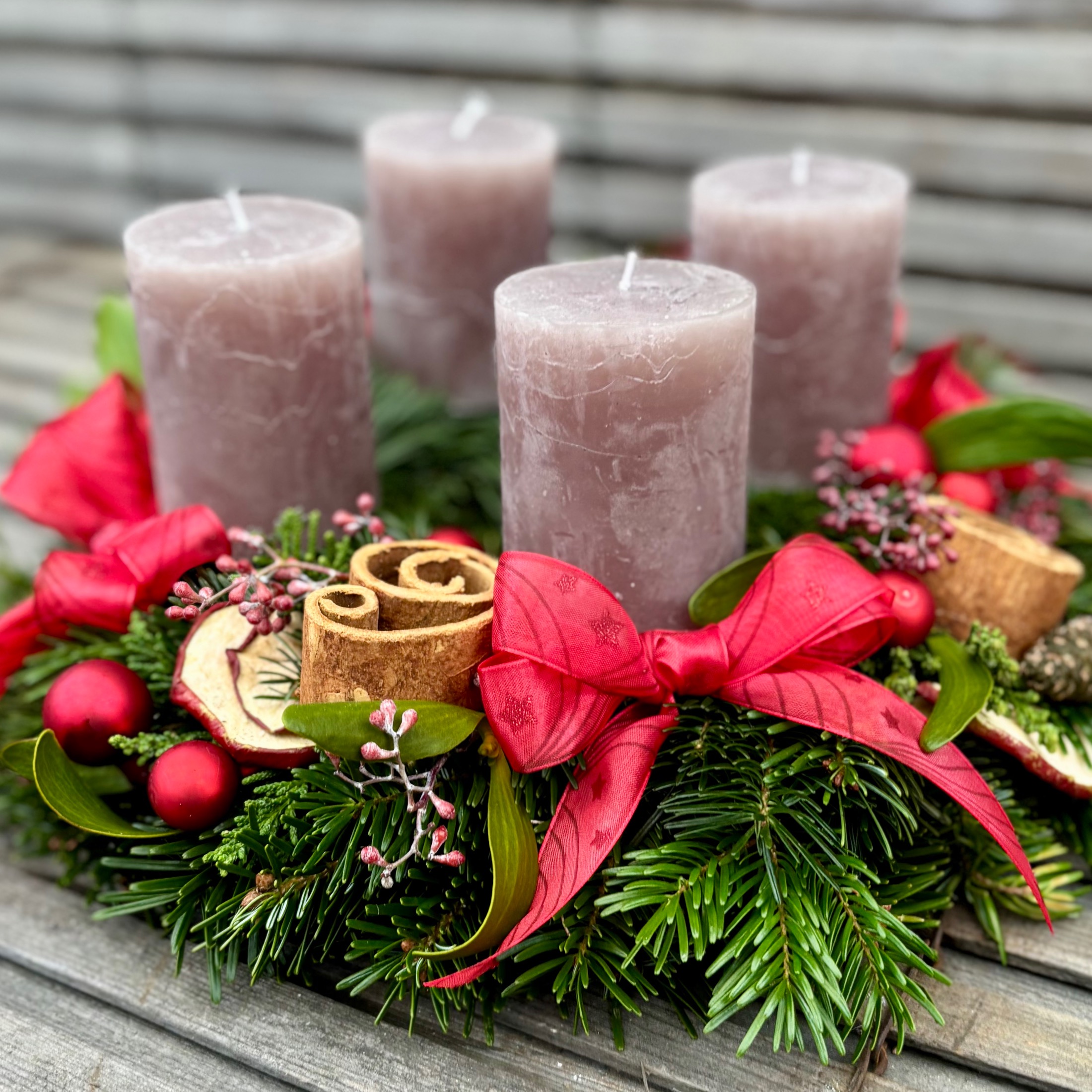 Gebundener Kranz aus Nordmanntanne (außen 30cm), durchgefärbte Kerzen (60/80) und passender Deko.