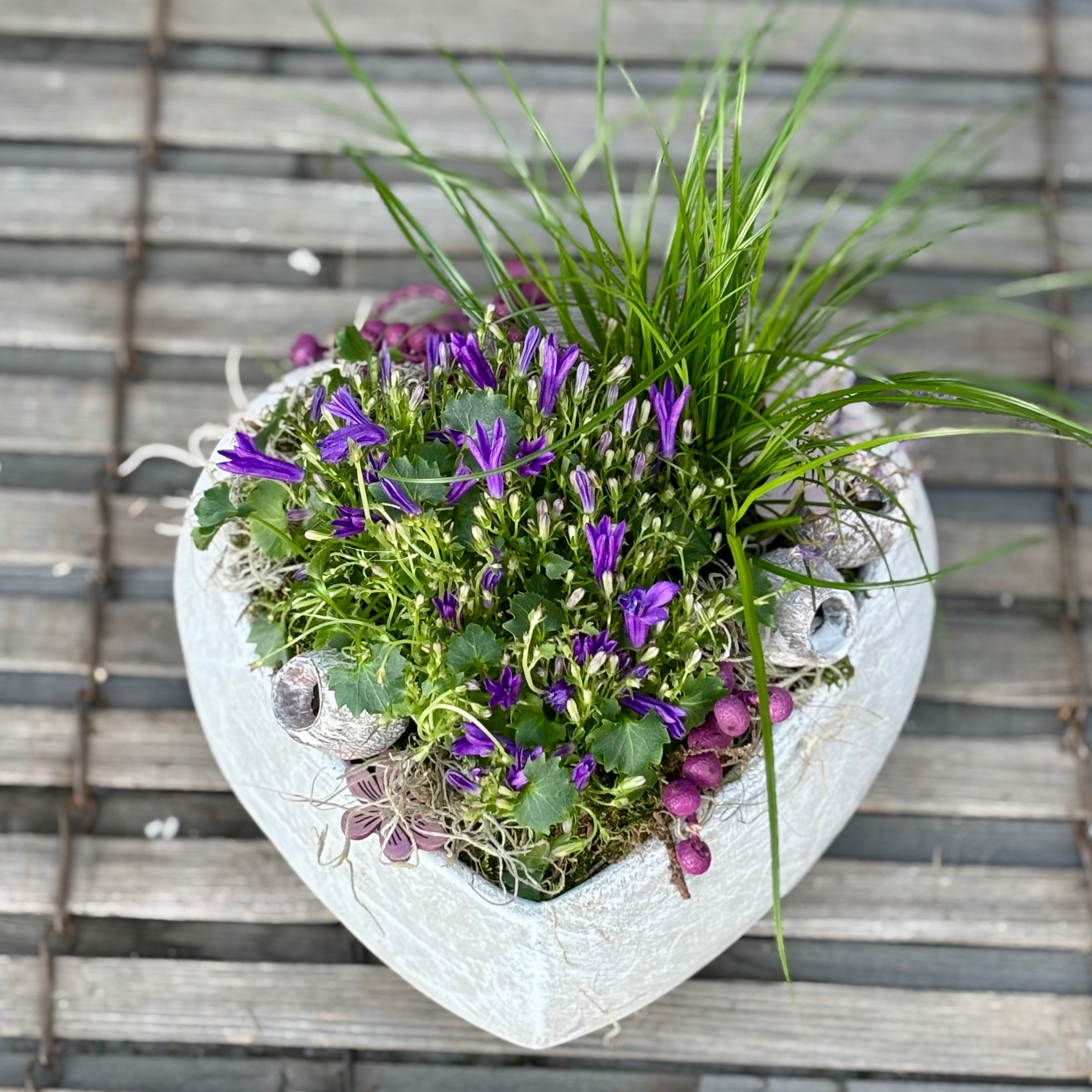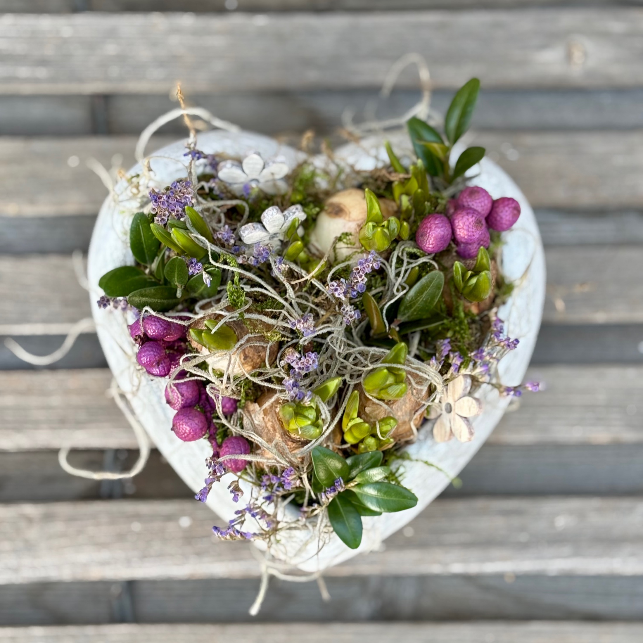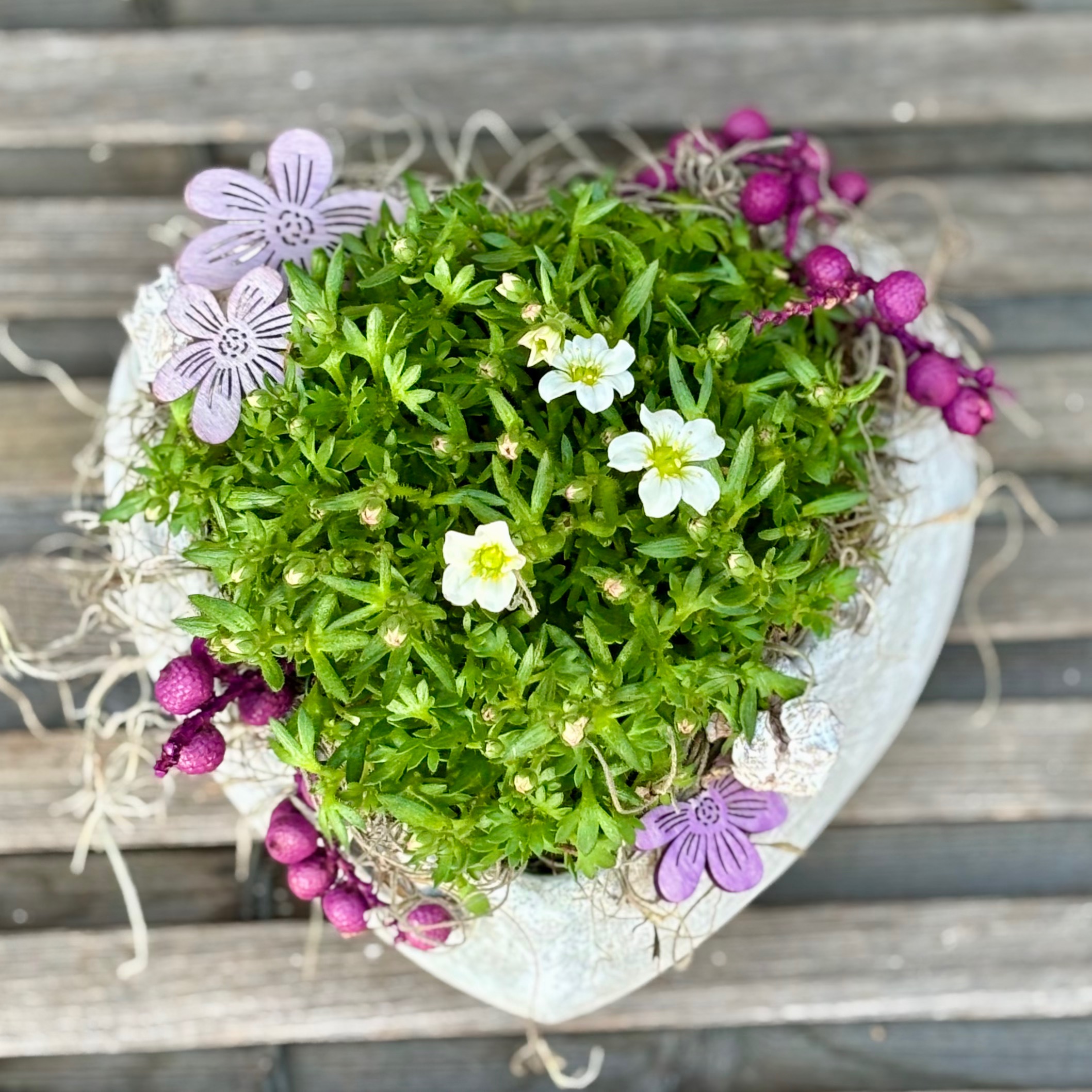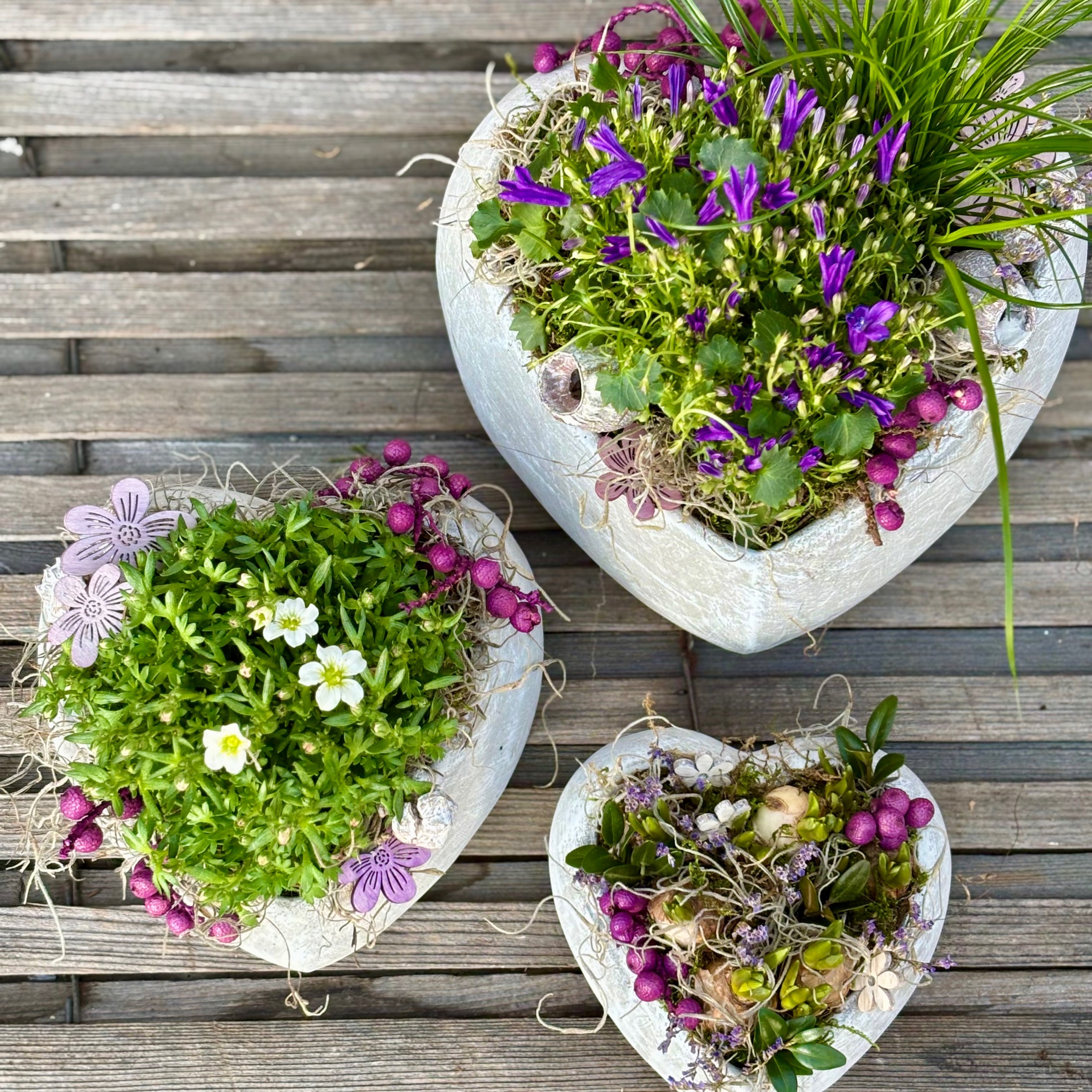Betonherz bepflanzt mit Frühlingspflanzen und passender Deko.