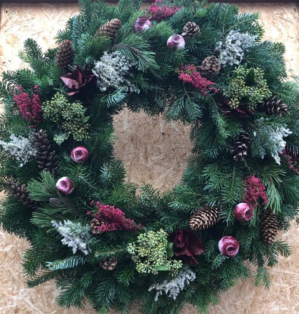 Handgebundener Kranz aus Nordmanntannenreisig, geschmüclt mir Koniferen, verschiedenen Zapfen und passenden Naturmaterialien.