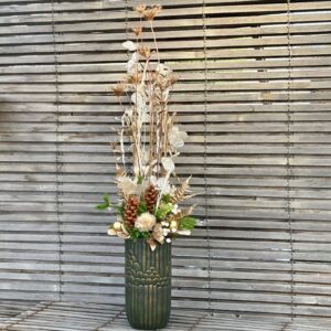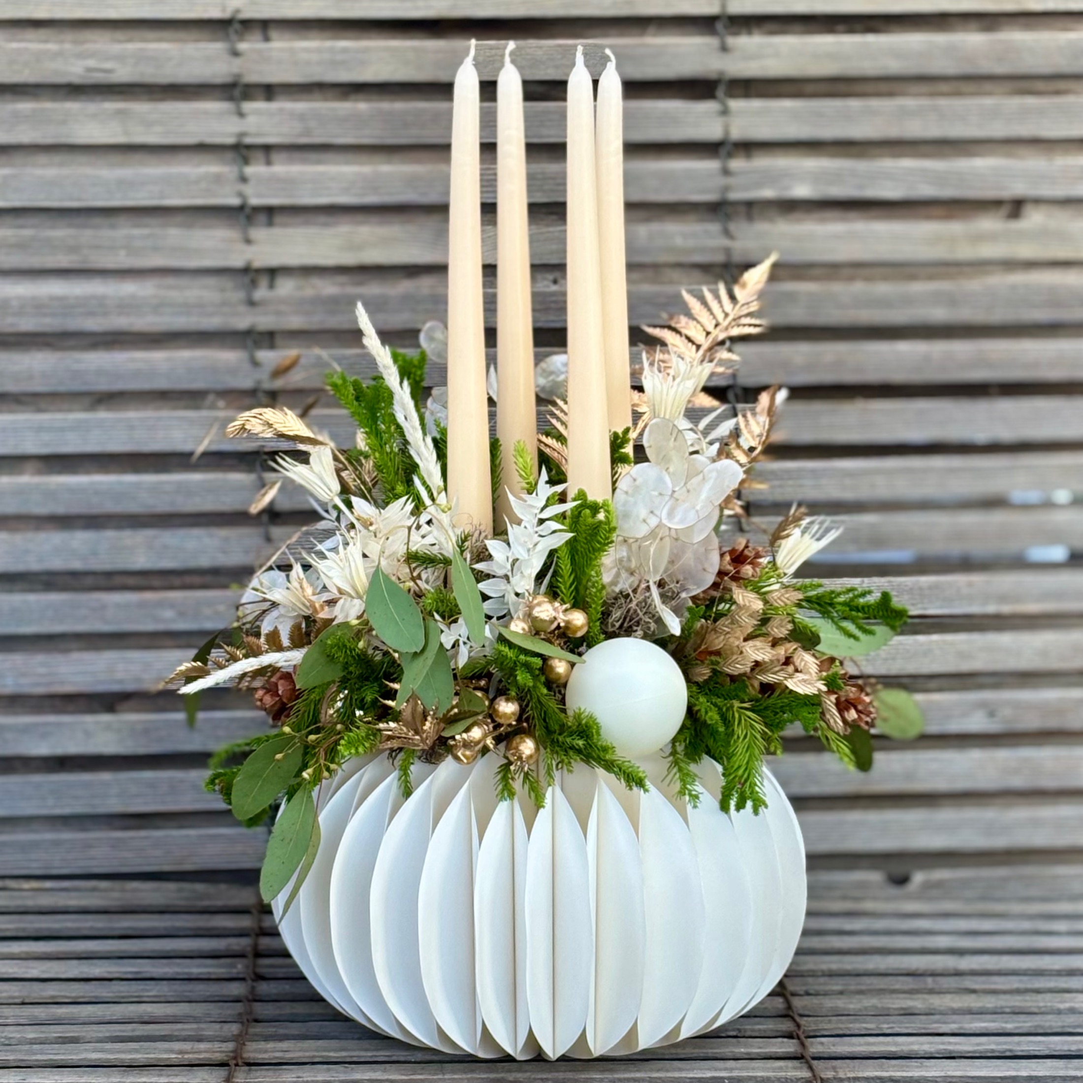 Papiersockel (faltbar) mit Gesteck aus heimischer Konifere, Kerzen und passender Deko.