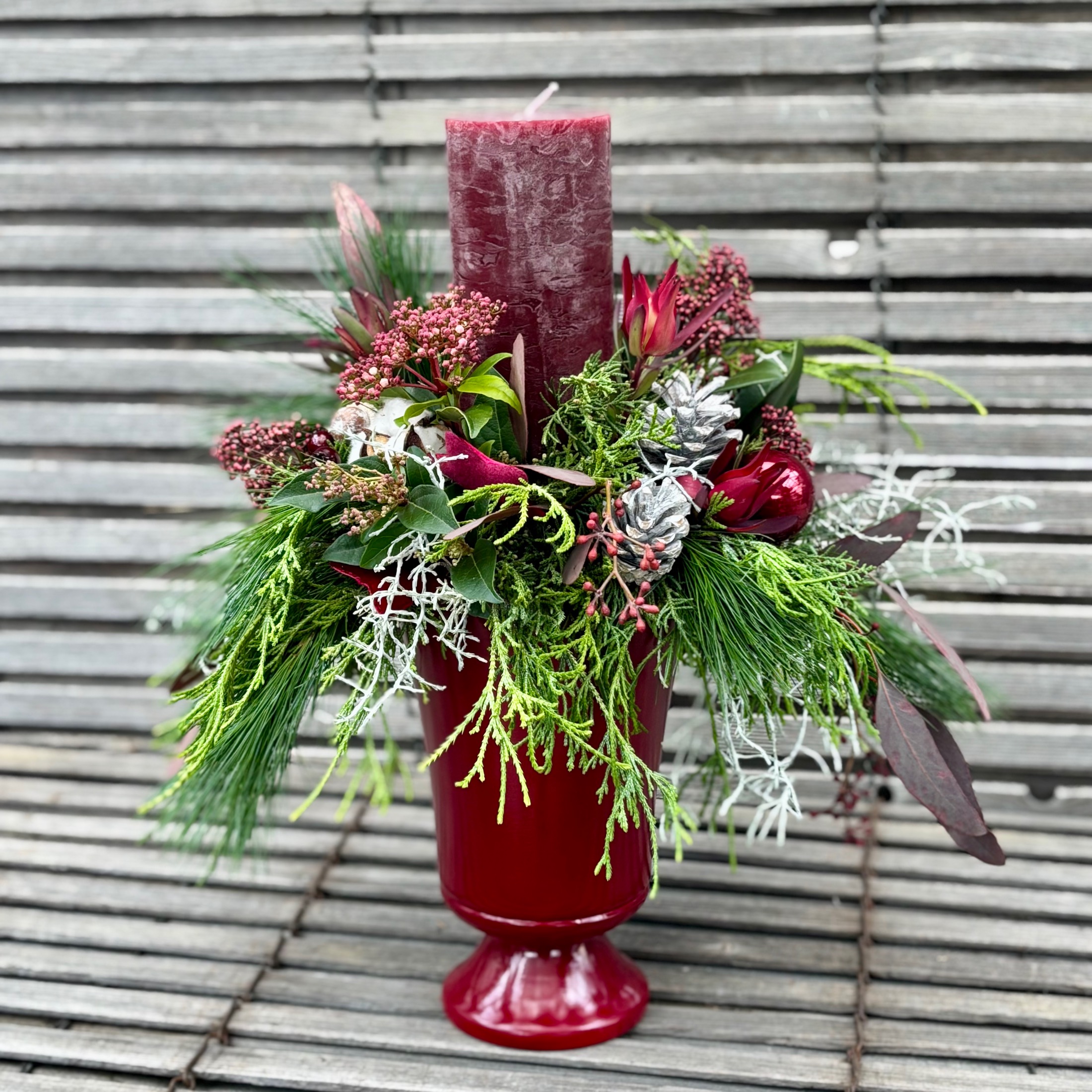 Schlichte dunkelrote Keramikserie befüllt mit Kerzen, heimischen Koniferen und passender Deko.
