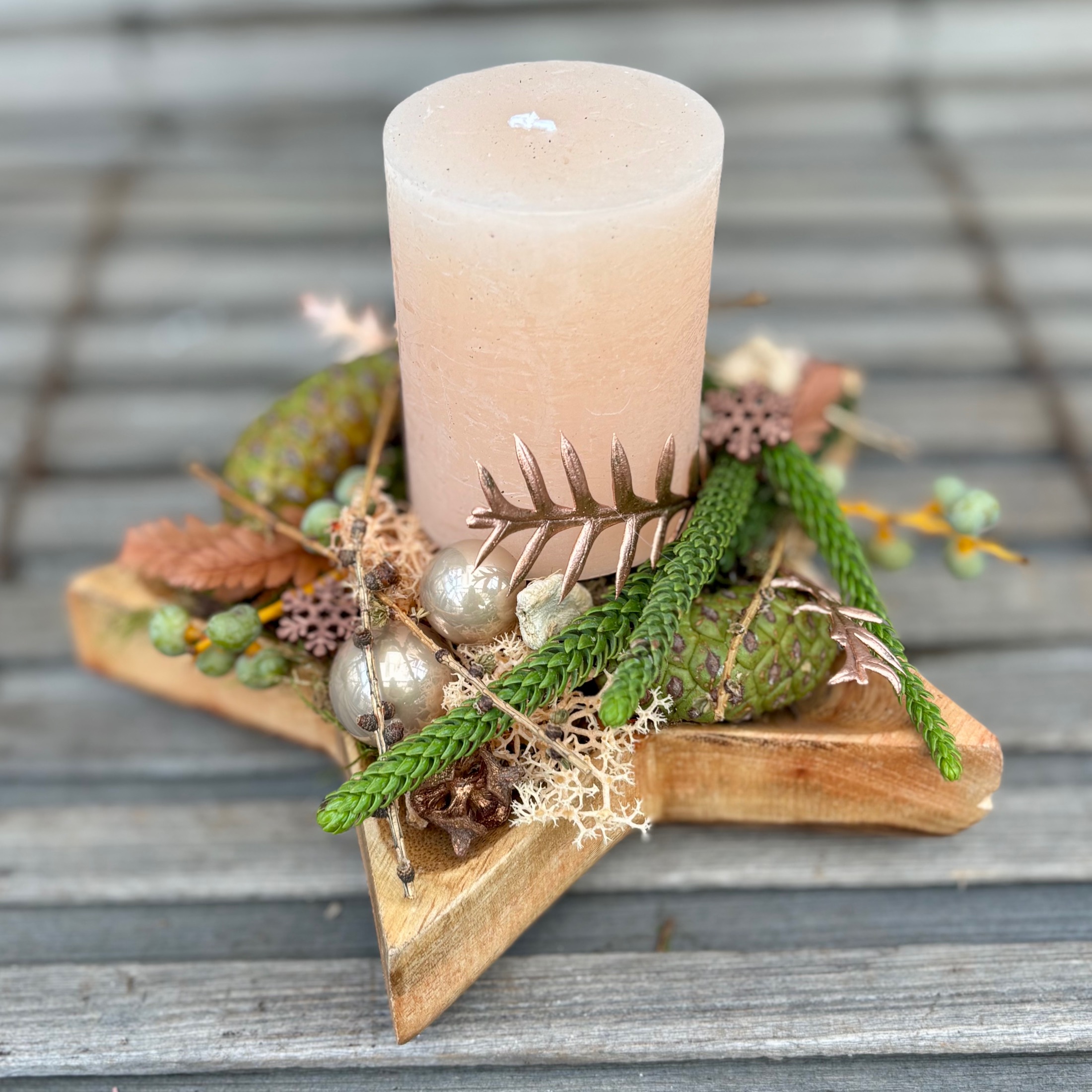 Holzschale in Sternform mit Kerze, Araucaria und passender Deko.