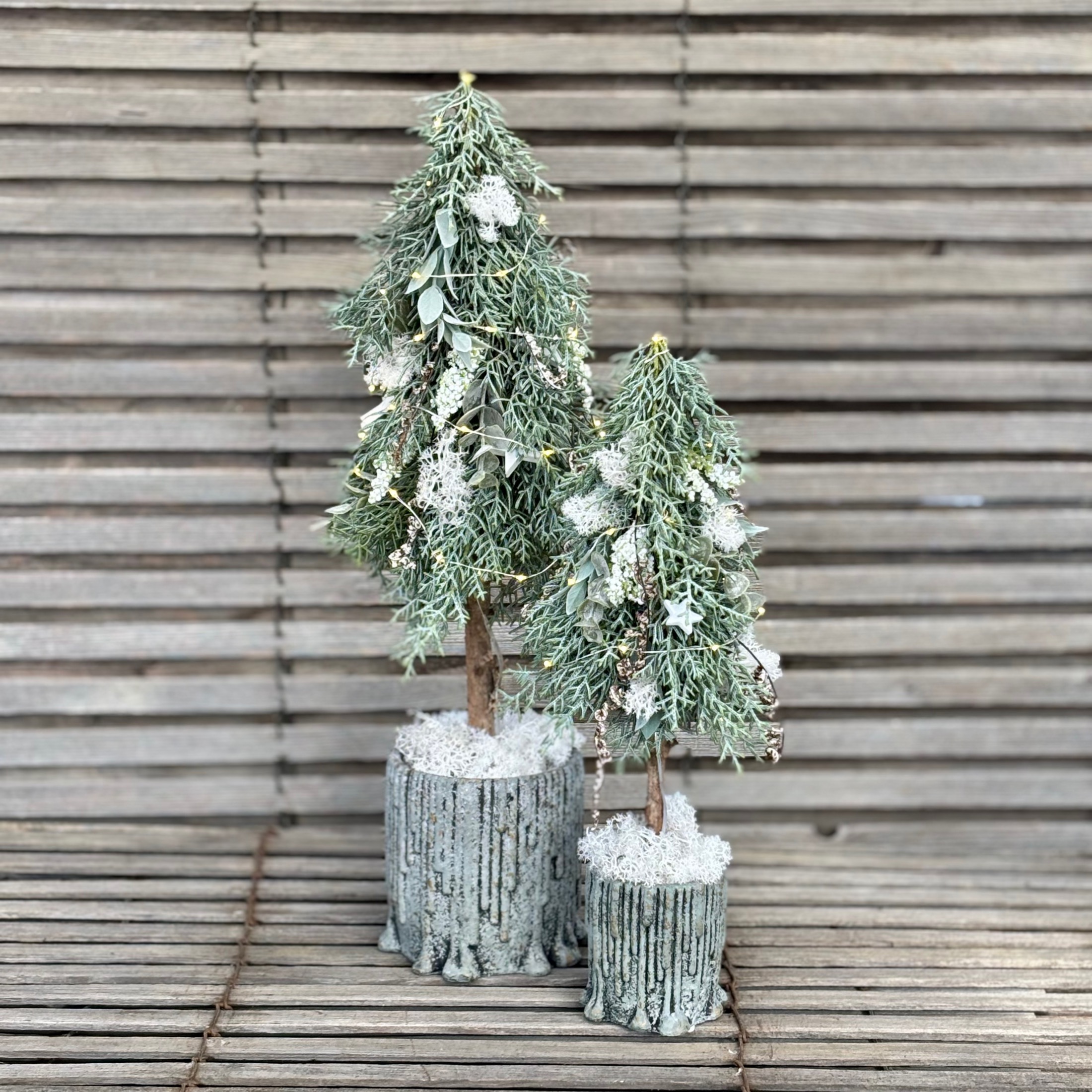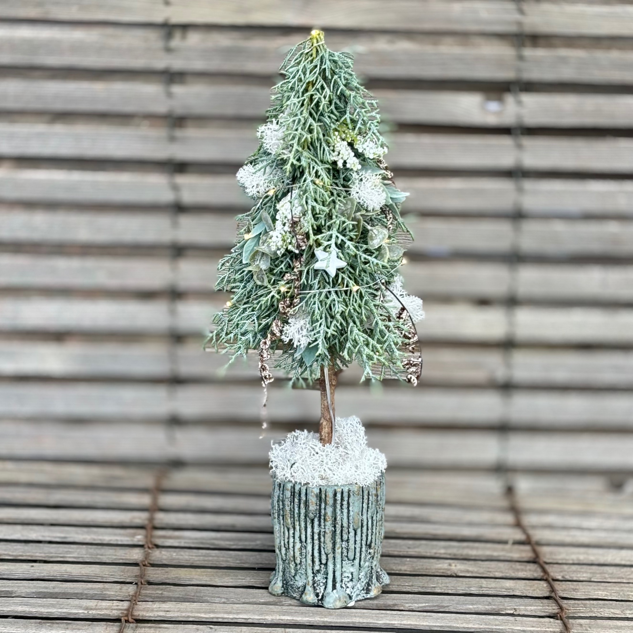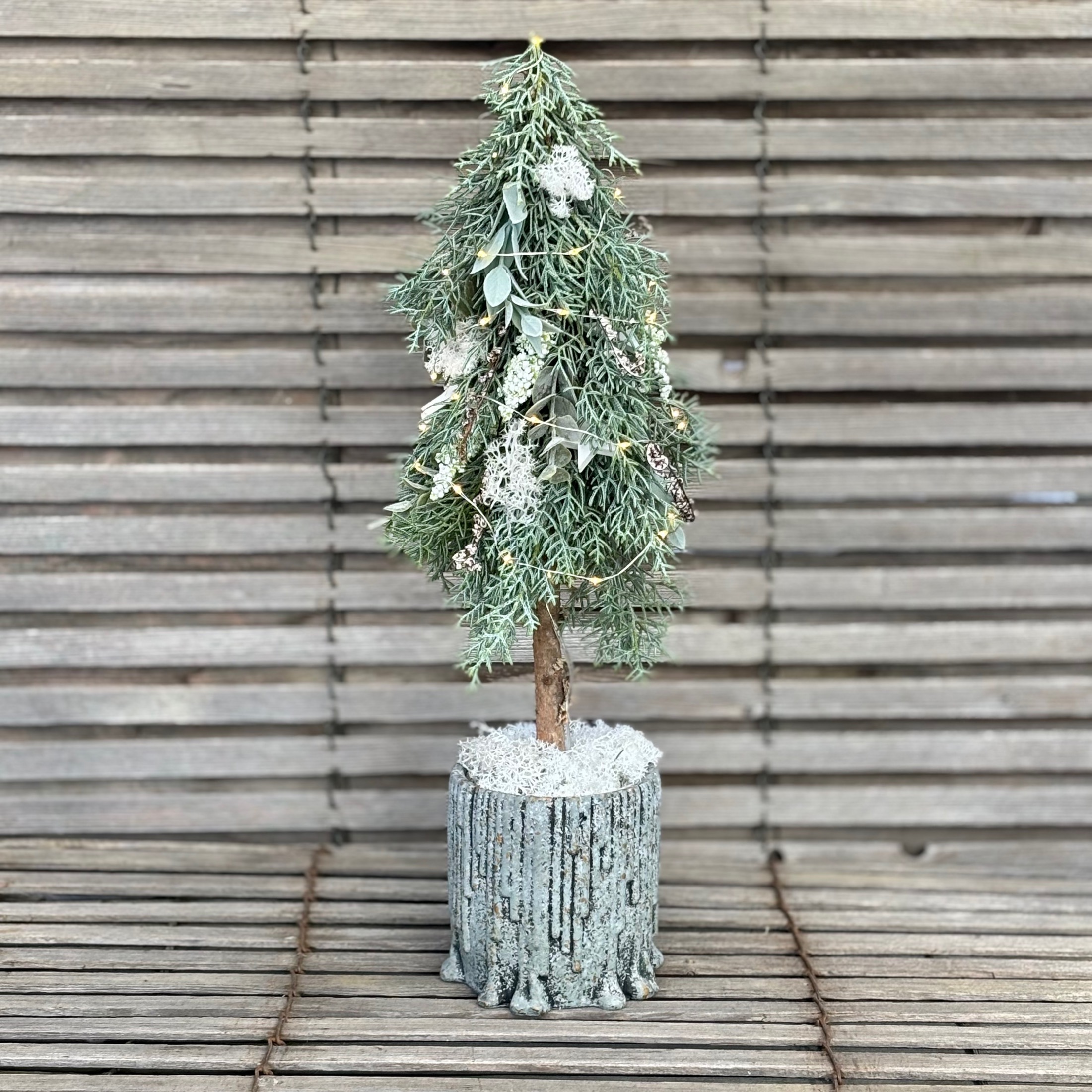 Hochwertige Keramik befüllt mit handgebundenem Bäumchen und Lichterkette.