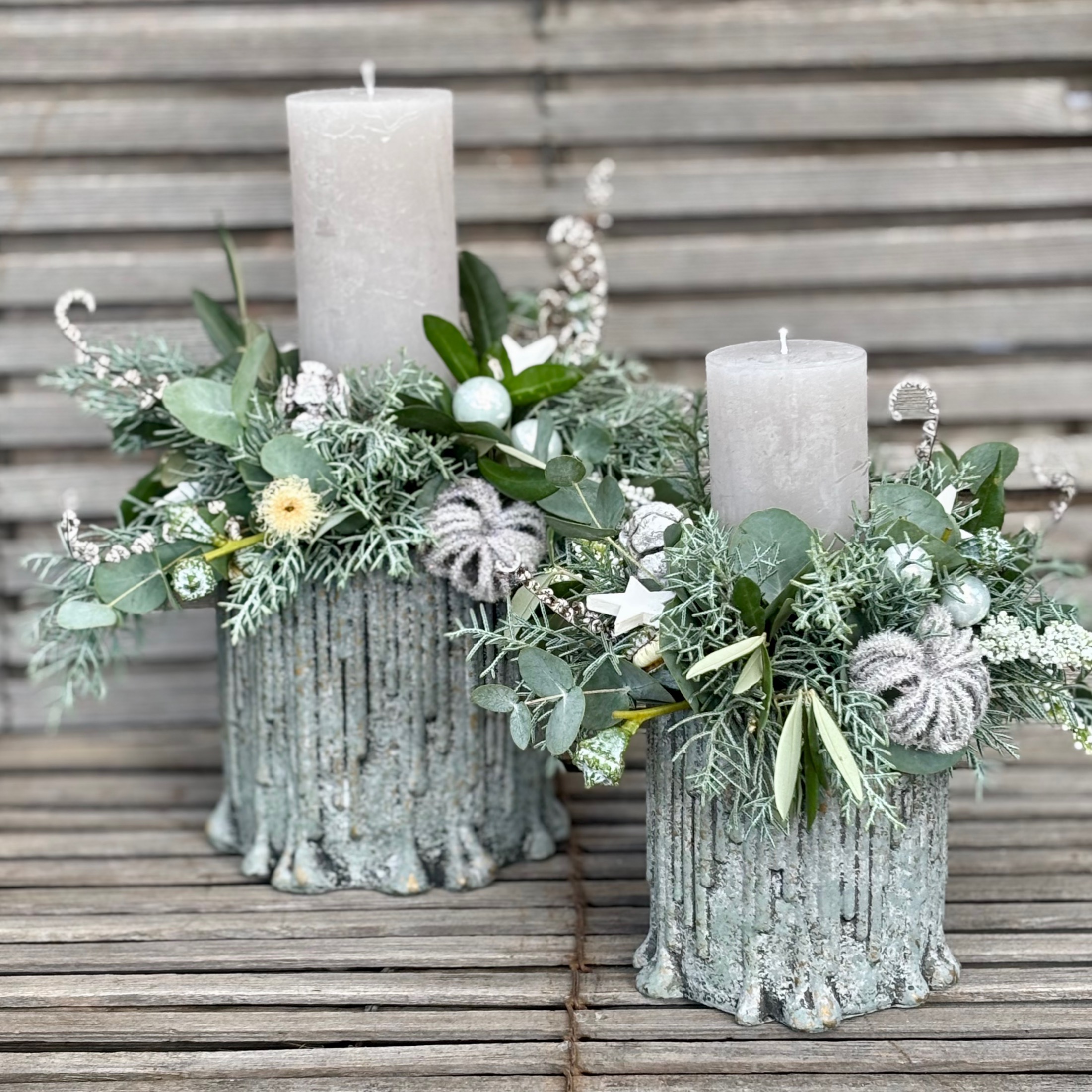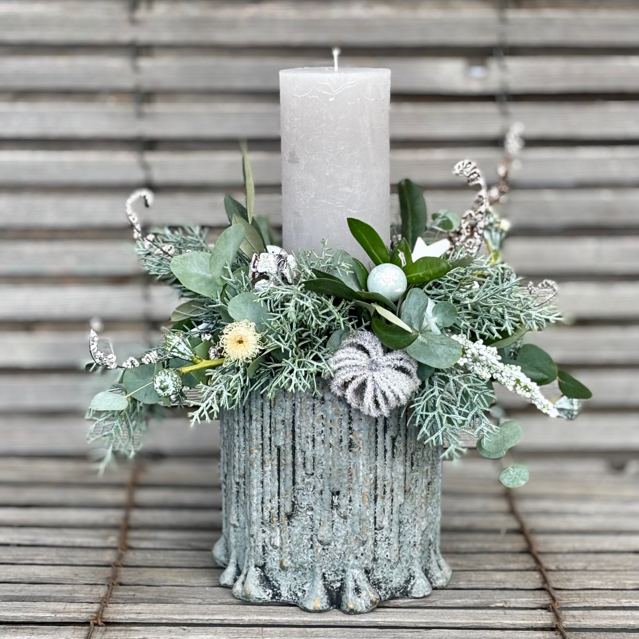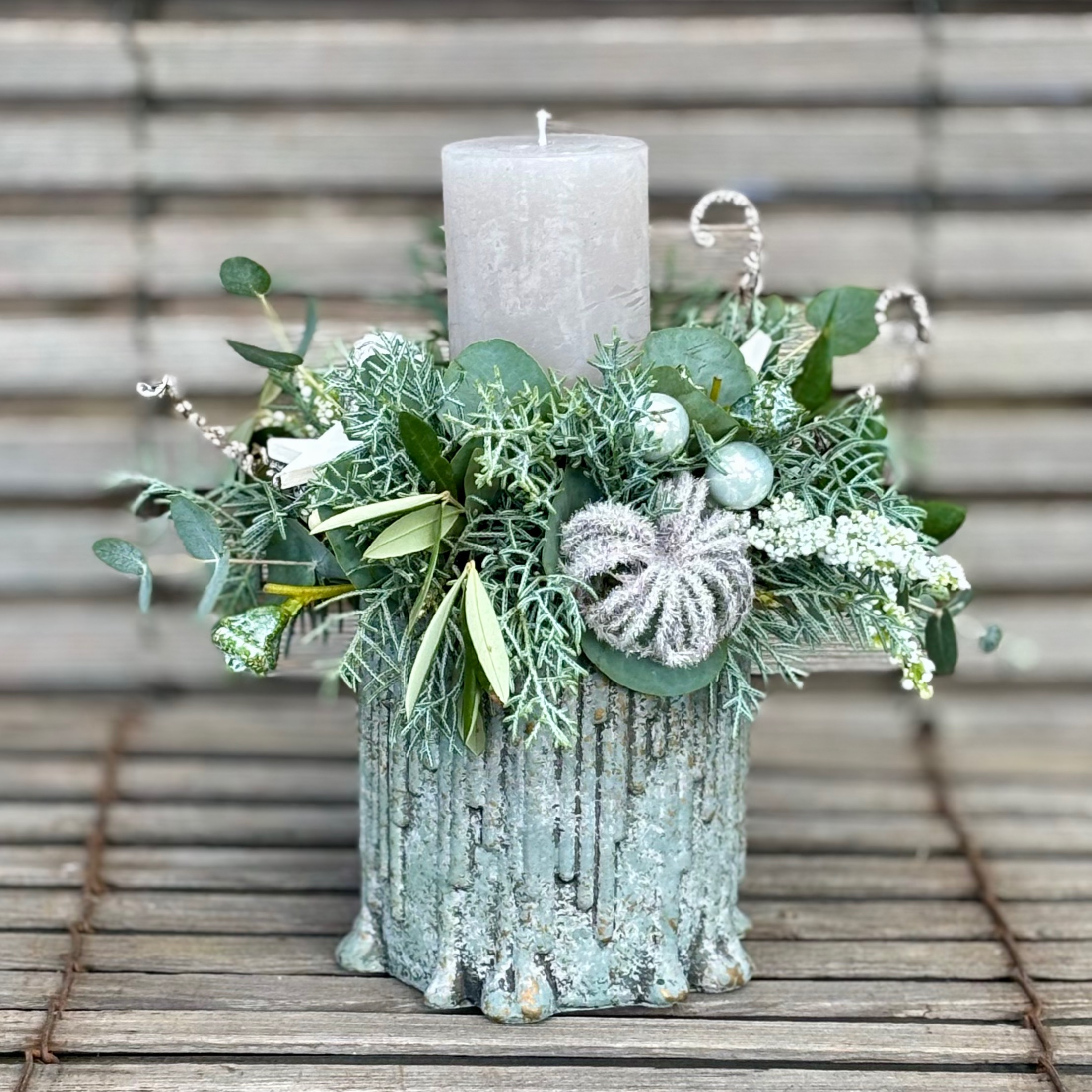 Hochwertige Keramik befüllt mit heimischen Koniferen, Kerze und passender Deko.