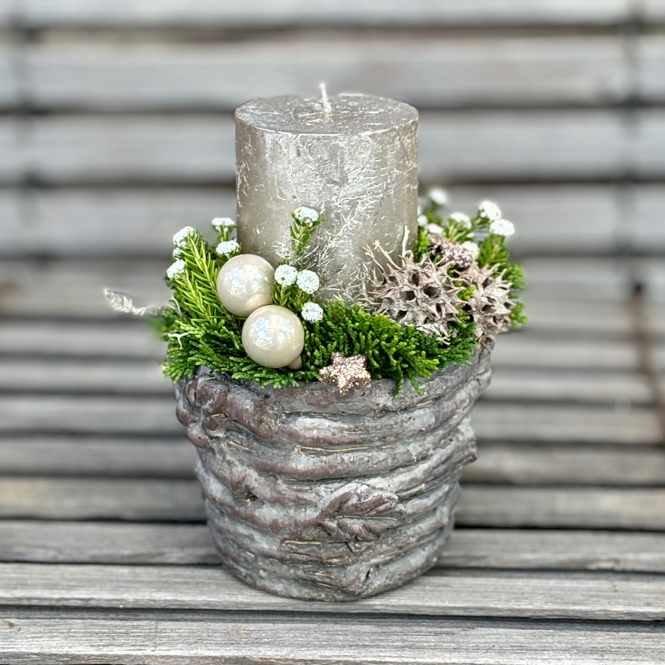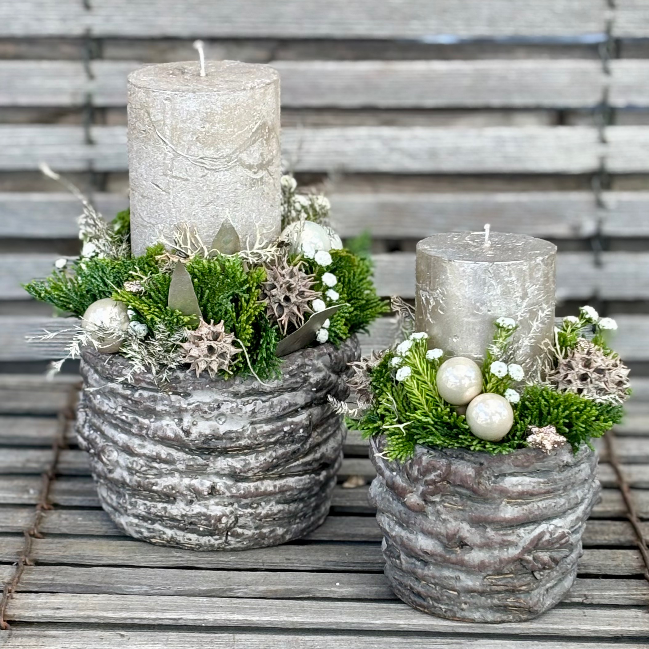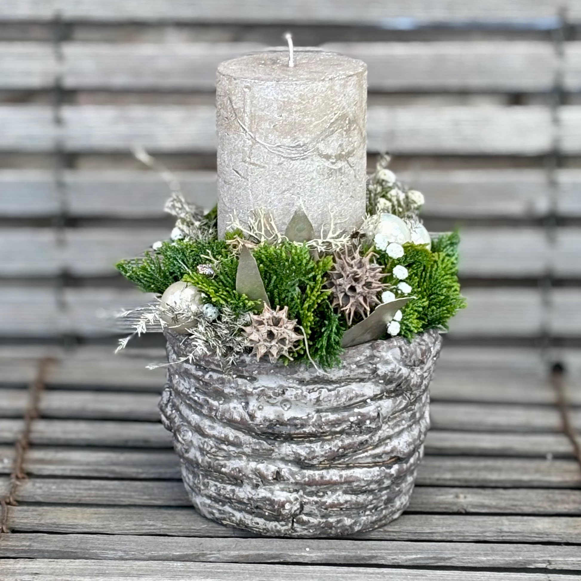 Massive rustikale Keramikserie befüllt mit heimischen Koniferen, Kerze und passender Deko.