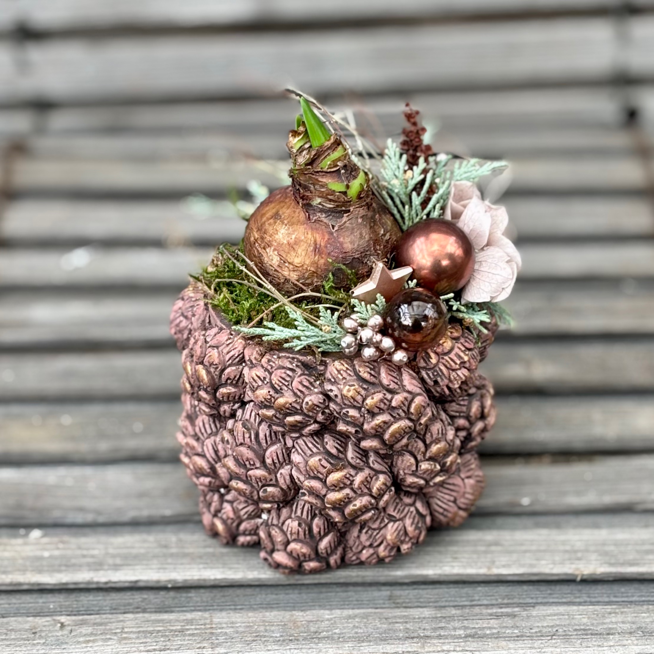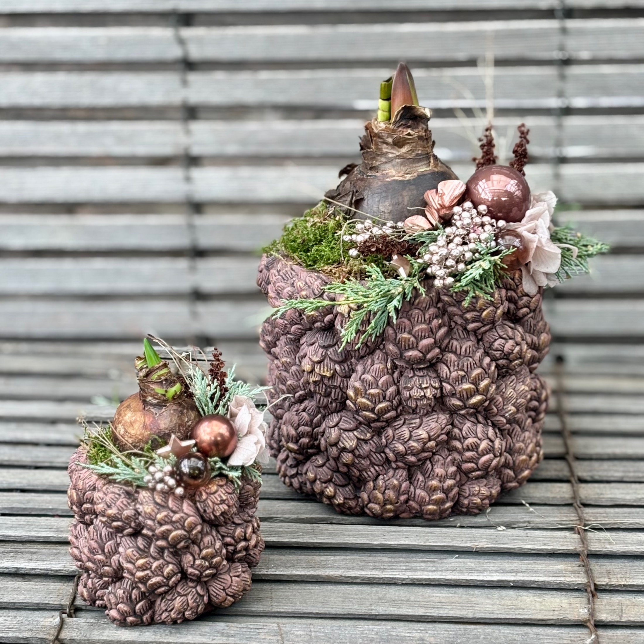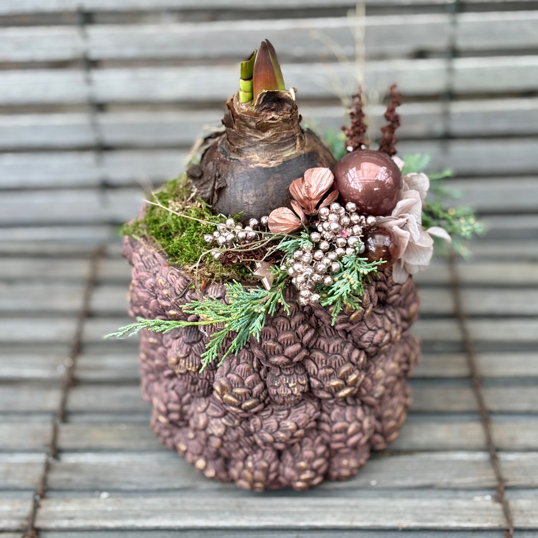 Dekorative Keramikserie bepflanzt mit Amaryllis (rosa) und passender Deko.