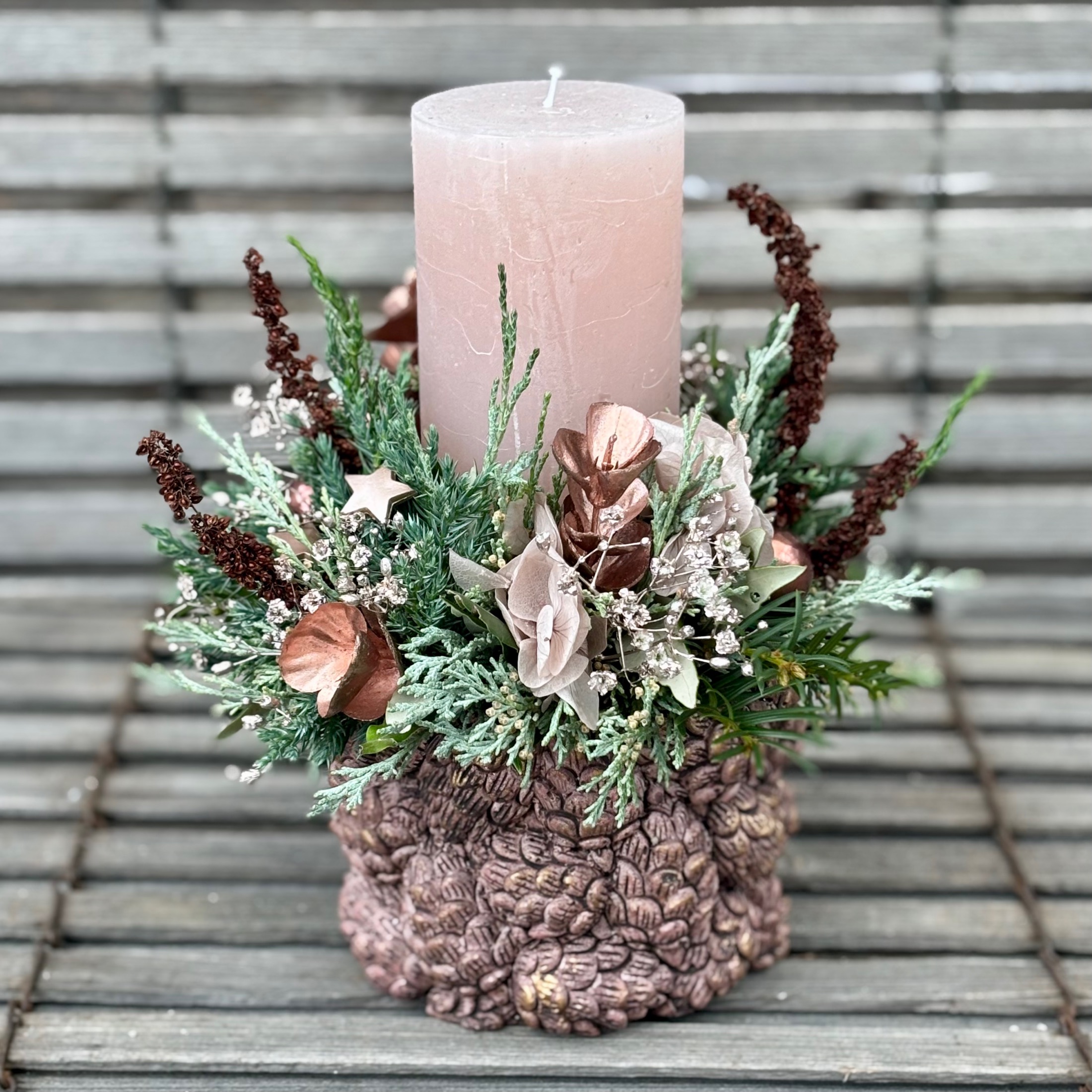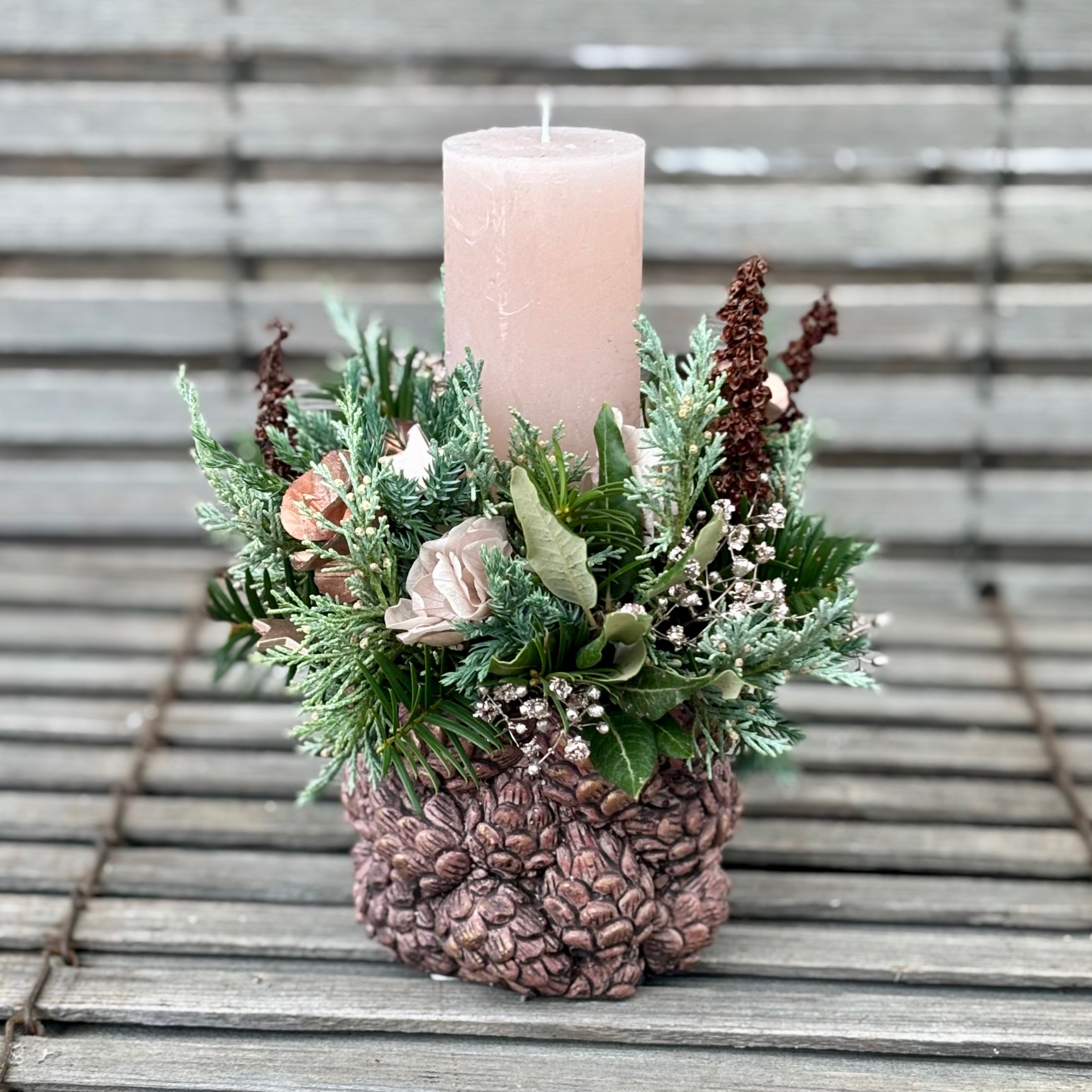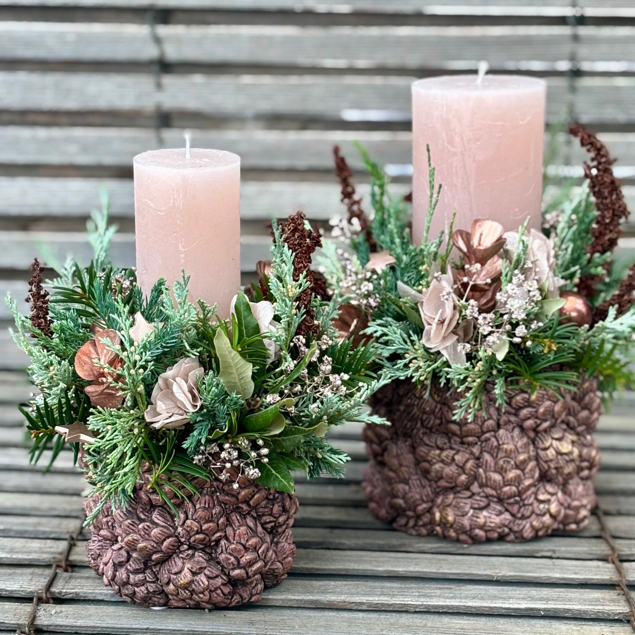 Dekorative Keramikserie befüllt mit Kerze, einheimischen Konifern und passender Deko.