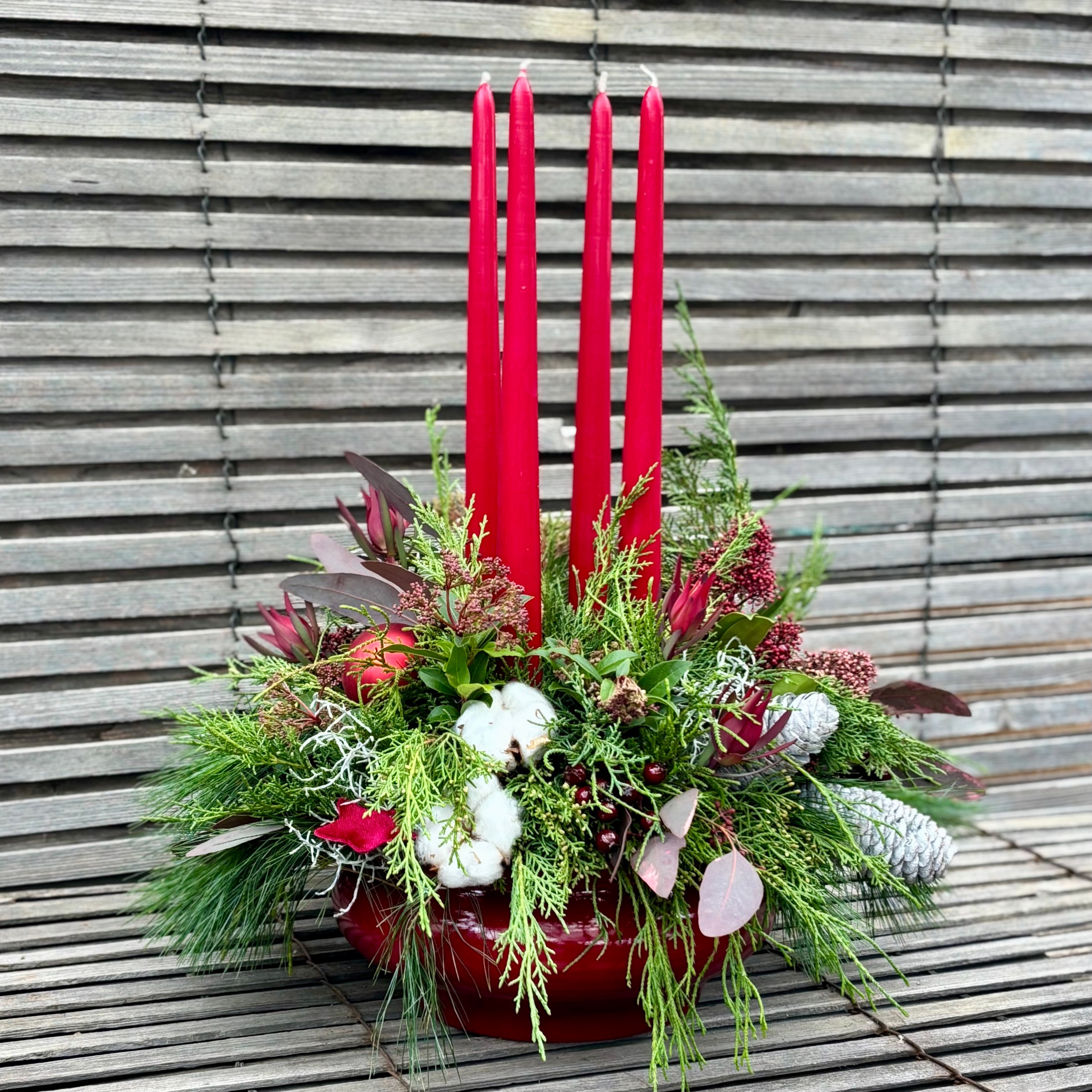 Schlichte dunkelrote Keramikserie befüllt mit Kerzen, heimischen Koniferen und passender Deko.