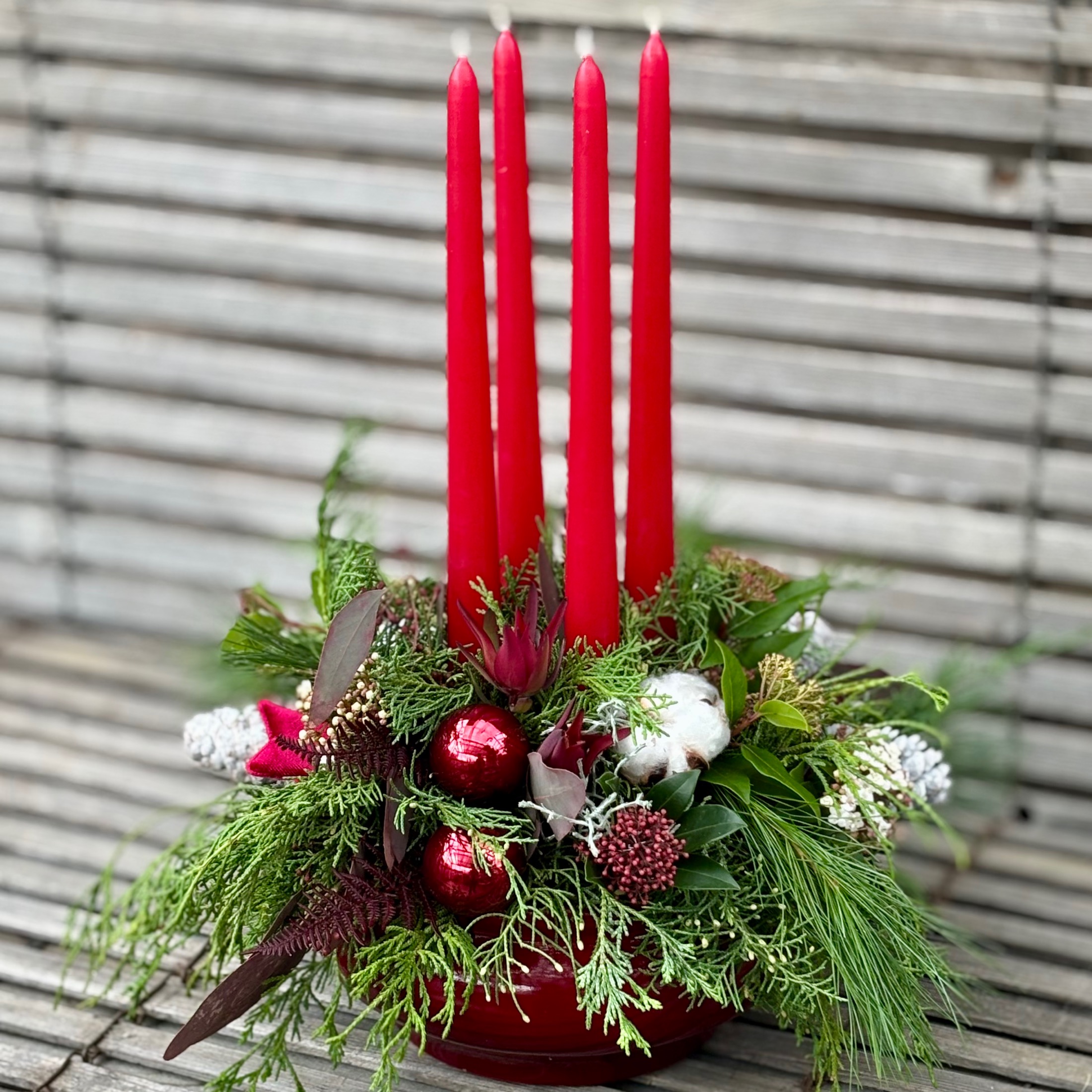 Schlichte dunkelrote Keramikserie befüllt mit Kerzen, heimischen Koniferen und passender Deko.